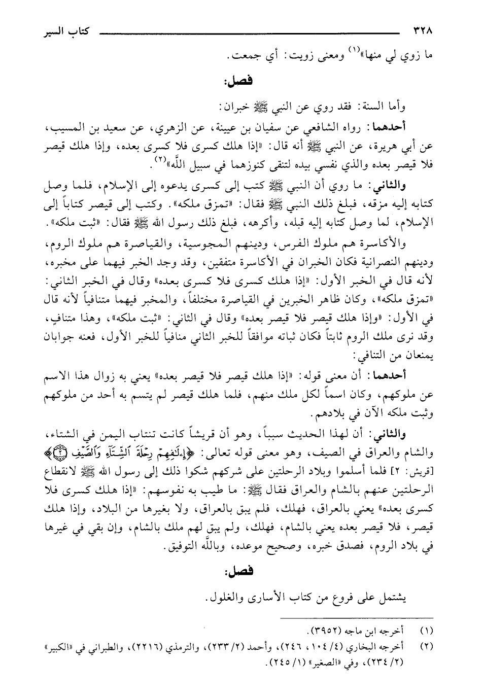 والثاني: ما روي أن النبي - صلى الله عليه وسلم- كتب إلى كسرى يدعوه إلى الإسلام، فلما وصل كتابه إليه مزقه، فبلغ ذلك النبي - صلى الله عليه وسلم- فقال: "تمزق ملكه". وكتب إلى قيصر كتابًا إلى الإسلام، لما وصل كتابه إليه قبله، وأكرمه، فبلغ ذلك رسول الله - صلى الله عليه وسلم- فقال: "ثبت ملكه". والأكاسرة هم ملوك الفرس، ودينهم المجوسية، والقياصرة هم ملوك الروم، ودينهم النصرانية. فكان الخبران في الأكاسرة متفقين، وقد وجد الخبر فيهما على مخبره: لأنه قال في الخبر الأول: إذا هلك كسرى فلا كسرى بعده، وقال في الخبر الثاني: تمزق ملكه، وكان ظاهر الخبرين في القياصرة مختلفًا، والمخبر فيهما متنافيًا لأنه قال في الأول: وإذا هلك قيصر فلا قيصر بعده، وقال في الثاني: ثبت ملكه، وهذا متناف، وقد نرى ملك الروم ثابتًا فكان ثباته موافقا للخبر الثاني منافيًا للخبر الأول، فعنه جوابان يمنعان من التنافي: