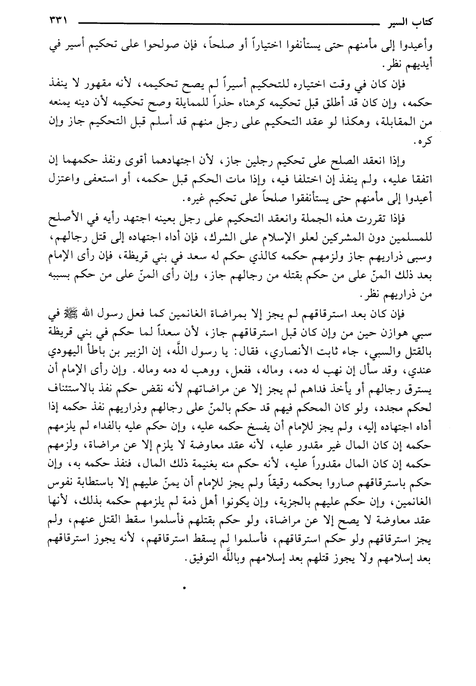 فإذا تقررت هذه الجملة وانعقد التحكيم على رجل بعينه اجتهد رأيه في الأصلح للمسلمين دون المشركين لعلو الإسلام على الشرك، فإن أداه اجتهاده إلى قتل رجالهم، وسبي ذراريهم جاز ولزمهم حكمه كالذي حكم له سعد في بني قريظة، فإن رأى الإمام بعد ذلك المن على من حكم بقتله من رجالهم جاز، وإن رأى المن على من حكم بسبيه من ذراريهم نظر.
