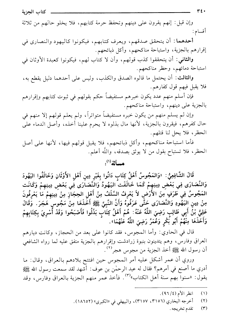 قال الشافعي: "والمجوس أهل كتاب دانوا بغير دين أهل الأوثان وخالفوا اليهود والنصارى في بعض دينهم كما خالفت اليهود والنصارى في بعض دينهم، وكانت المجوس في طرف من الأرض لا يعرف السلف من أهل الحجاز من دينهم ما يعرفون من دين اليهود والنصارى حتى عرفوه وأن النبي - صلى الله عليه وسلم- أخذها من مجوس هجر وقال علي بن أبي طالب - رضي الله عنه -: هم أهل كتاب بدلوا فأصبحوا وقد أسري بكتابهم وأخذها منهم أبو بكر وعمر - رضي الله عنهما ".