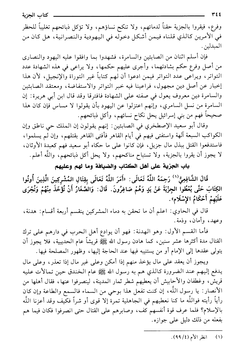 قال الشافعي - رحمه الله تعالى -: " أمر الله تعالى بقتال المشركين من الذين أوتوا الكتاب حتى يعطوا الجزية عن يد وهم صاغرون، قال: والصغار أن تؤخذ منهم وتجرى عليهم أحكام الإسلام ".
