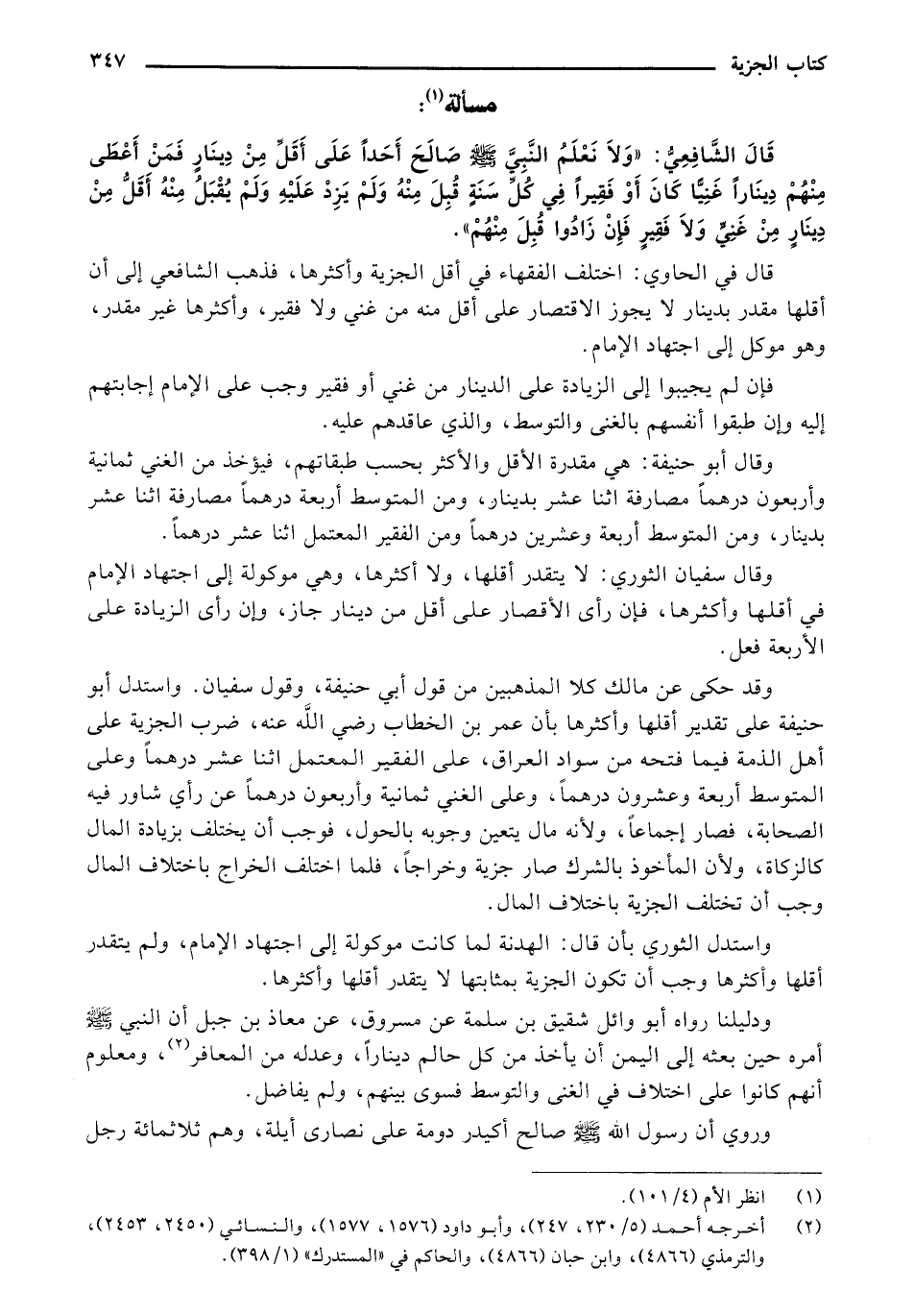 قال الشافعي: " ولا نعلم النبي - صلى الله عليه وسلم- صالح أحدًا على أقل من دينار، فمن أعطى منهم دينارًا غنيًا كان أو فقيرًا في كل سنة قبل منه ولم يزد عليه، ولم يقبل منه أقل من دينار من غني ولا فقير، فإن زادوا قبل منهم ".