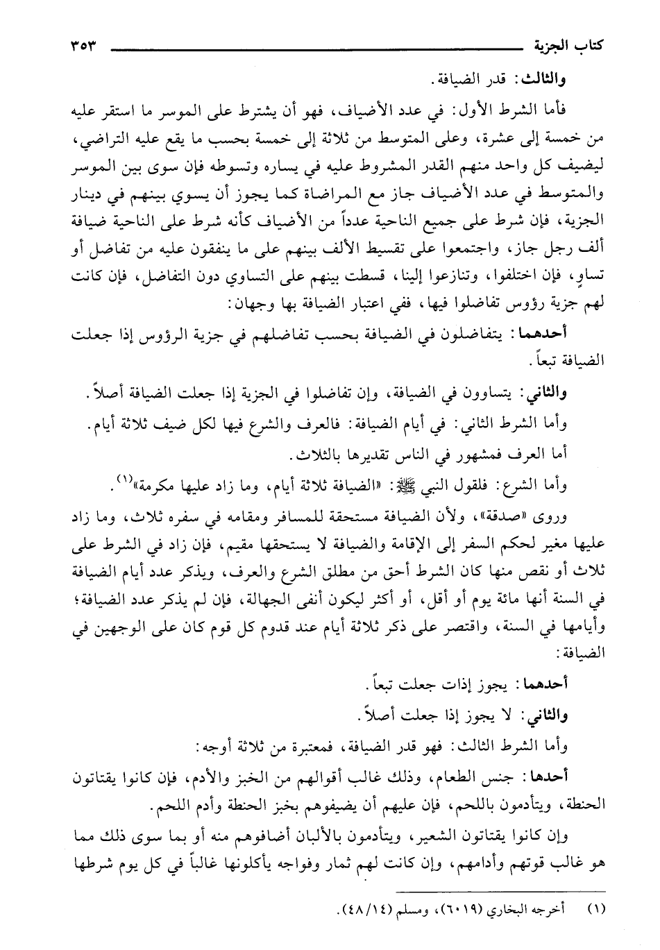 وروى "صدقة"، ولأن الضيافة مستحقة للمسافر ومقامه في سفره ثلاث، وما زاد عليها مغير لحكم السفر إلي الإقامة والضيافة لا يستحقها مقيم، فإن زاد في الشرط علي ثلاث أو نقص منها كان الشرط أحق من مطلق الشرع والعرف، ويذكر عدد أيام الضيافة في السنة أنها مائة يوم أو اقل، أو أكثر ليكون أنفي الجهالة، فإن لم يذكر عدد الضيافة، وأيامها في السنة، واقتصر علي ذكر ثلاثة أيام عند قدوم كل قوم كان علي الوجهين في الضيافة: