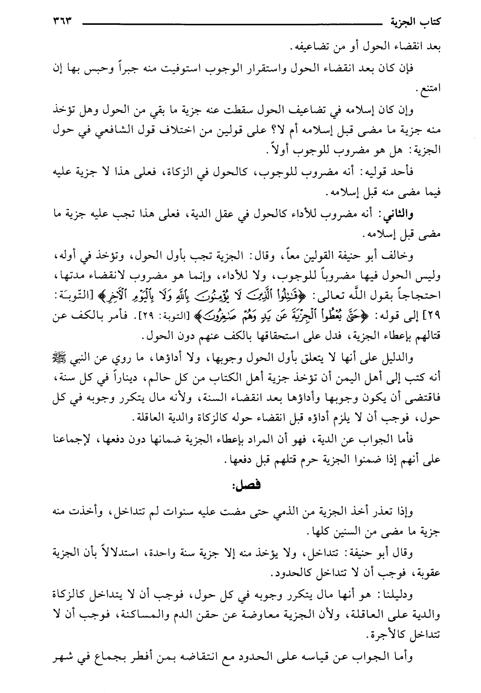 وخالف أبو حنيفة القولين معًا، وقال: الجزية تجب بأول الحول، وتؤخذ في أوله، وليس الحول فيها مضروبًا للوجوب، ولا للأداء، وإنما هو مضروب لانقضاء مدتها، احتجاجًا بقول الله تعالى: {قَاتِلُوا الَّذِينَ لاَ يُؤْمِنُونَ بِاللَّهِ وَلاَ بِالْيَوْمِ الآخِرِ} [التوبة:29] إلى قوله: {حَتَّى يُعْطُوا الْجِزْيَةَ عَن يَدٍ وَهُمْ صَاغِرُونَ} [التوبة:29]. فأمر بالكف عن قتالهم بإعطاء الجزية، فدل على استحقاقها بالكف عنهم دون الحول.