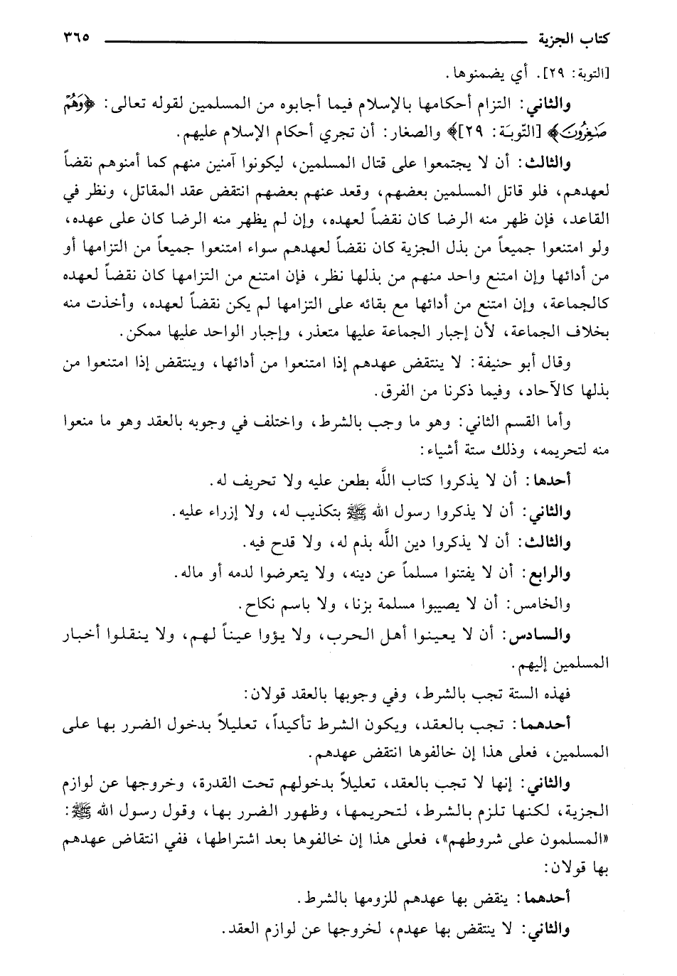والثاني: إنها لا تجب بالعقد، تعليلًا بدخولهم تحت القدرة، وخروجها عن لوازم الجزية، لكنها تلزم بالشرط، لتحريمها، وظهور الضرر بها، وقول رسول الله صلى الله عليه وسلم: "المسلمون على شروطهم"، فعلى هذا إن خالفوها بعد اشتراطها، ففي انتقاض عهدهم بها قولان: