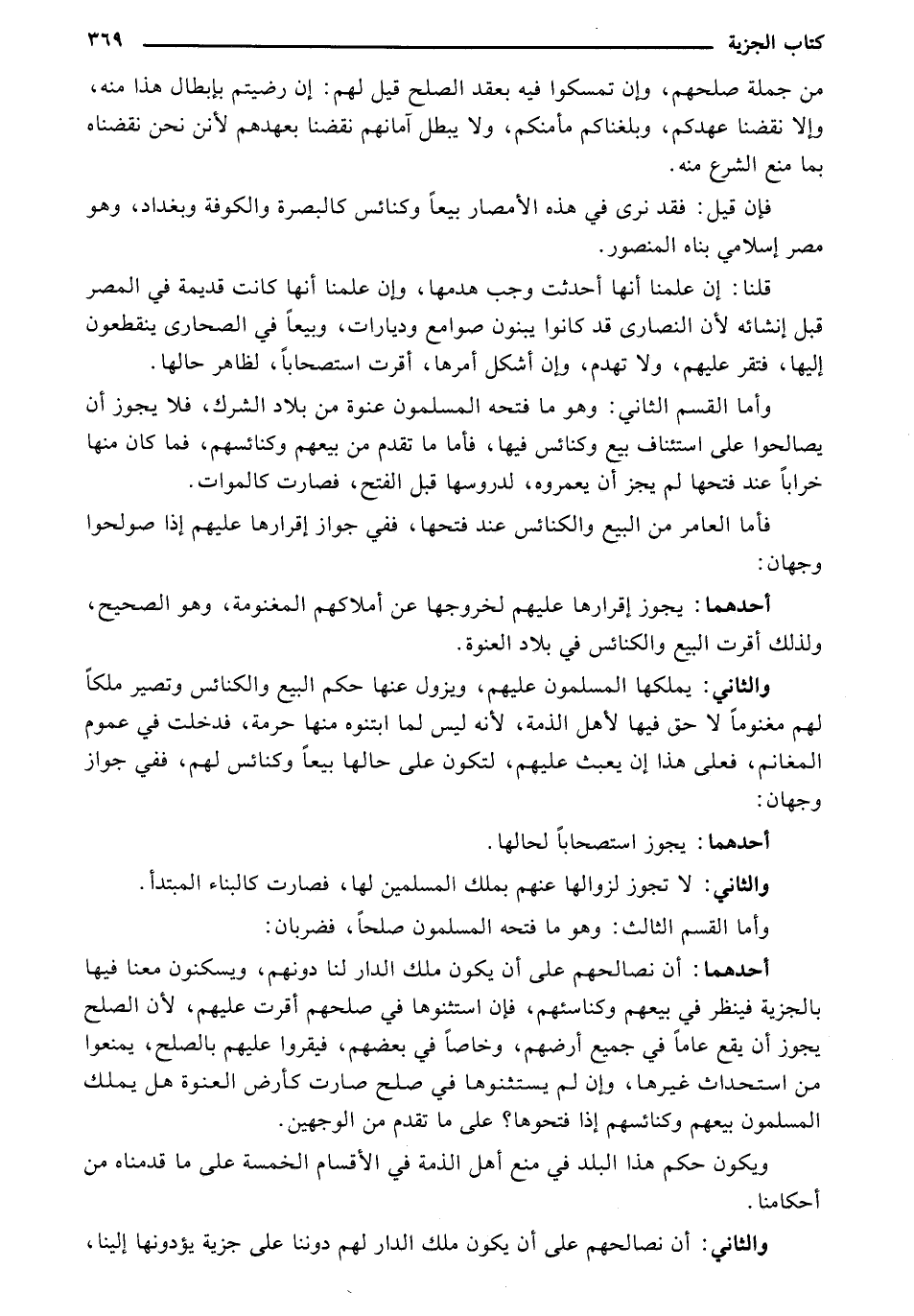 فإن قيل: فقد نرى في هذه الأمصار بيعًا وكنائس كالبصرة والكوفة وبغداد، وهو مصر إسلامي بناه المنصور.