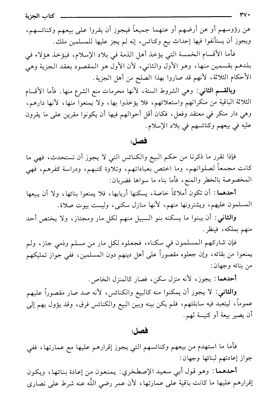 فإذا تقرر ما ذكرنا من حكم البيع والكنائس التي لا يجوز أن تستحدث، فهي ما كانت مجمعًا لصلواتهم، وما اختص بعباداتهم، وتلاوة كتبهم، ودراسة كفرهم، فهي المخصوصة بالخطر والمنع، فأما بناء ما سواها فضربان: