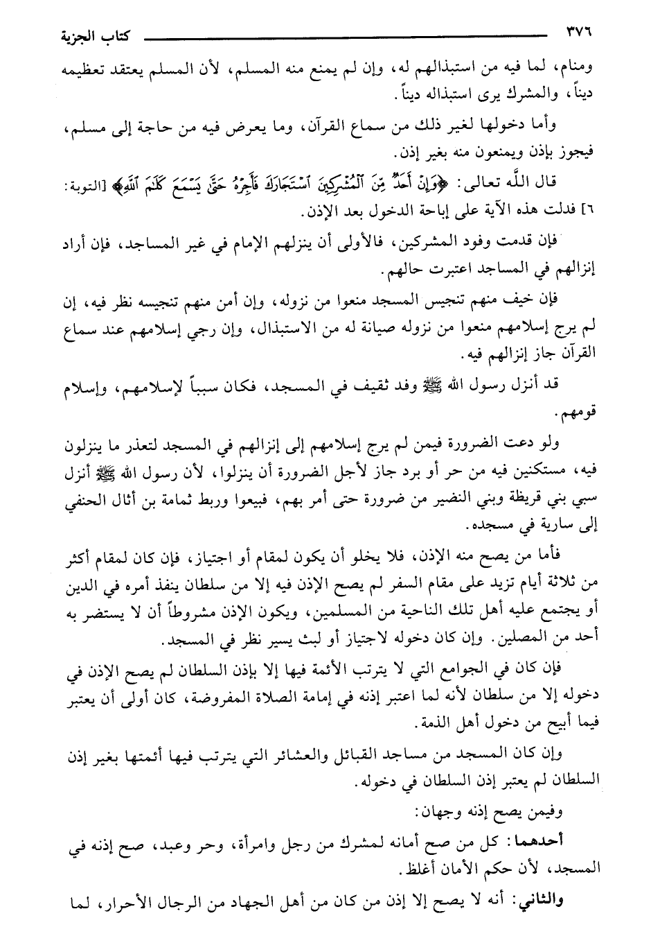 فأما من يصح منه الإذن ن فلا يخلو أن يكون لمقام أو اجتياز، فإن كان لمقام أكثر من ثلاثة أيام تزيد علي مقام السفر لم يصح الإذن فيه إلا من سلطان ينفذ أمره في الدين أو يجمع عليه أهل تلك الناحية من المسلمين، ويكون الإذن مشروطا أن لا يستضر به أحد من المصلين. وإن كان دخوله لاجتياز أو لبث يسير نظر في المسجد.
