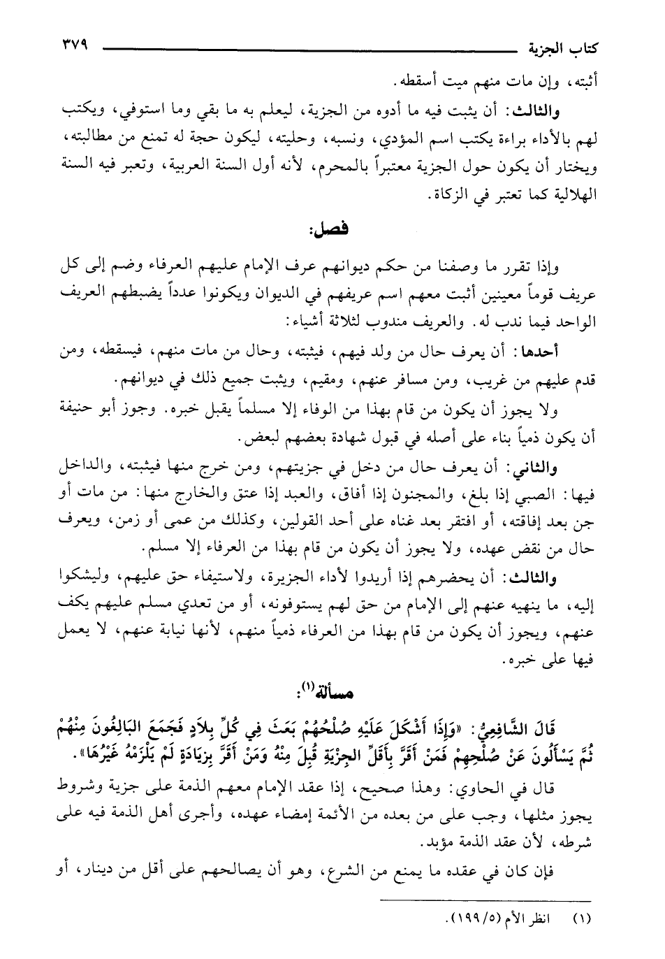 قال الشافعي: "وإذا أشكل عليه صلحهم بعث في كل بلاد فجمع البالغون منهم ثم يسألون عن صلحهم فمن أقر بأقل الجزية قبل منه ومن أقر بزيادة لم يلزمه غيرها".