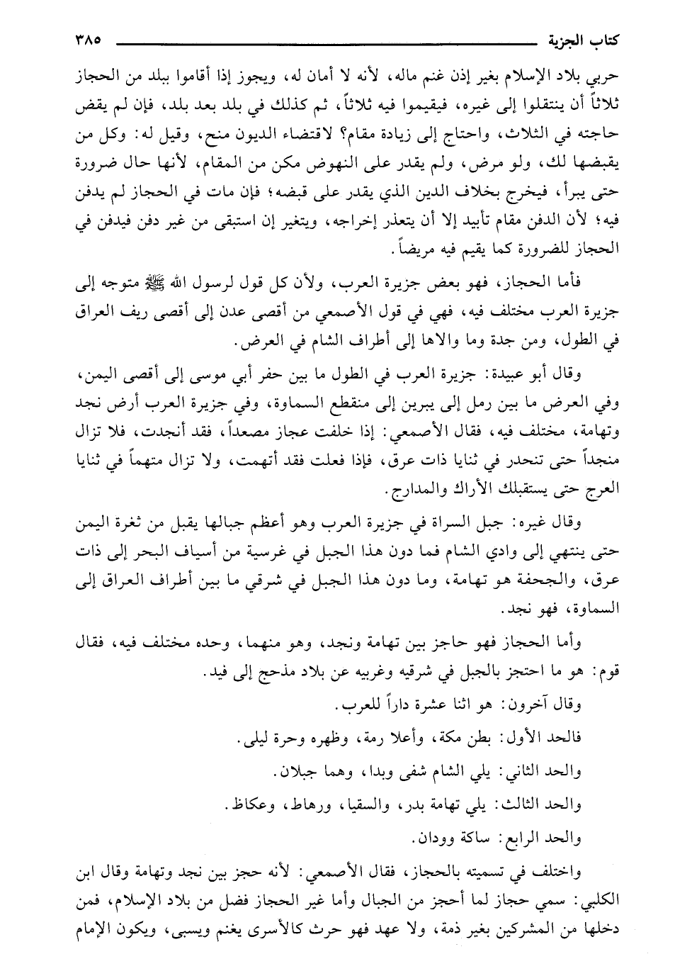 واختلف في تسميته بالحجاز، فقال الأصمعي: لأنه حجز بين نجد وتهامة وقال ابن الكلبي: سمي حجاز لما أحجز من الجبال وأما غير الحجاز فضل من بلاد الإسلام، فمن دخلها من المشركين بغير ذمة، ولا عهد فهو حرث كالأسرى يغنم ويسبى، ويكون الإمام