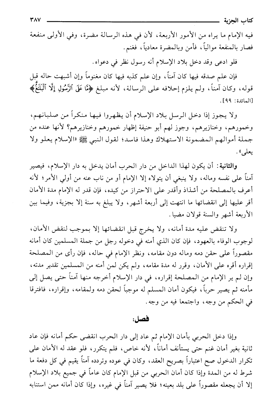 والثانية: أن يكون لهذا الداخل من دار الحرب أمان يدخل به دار الإسلام، فيصير آمنا على نفسه وماله، ولا ينبغي أن يتولاه إلا الإمام أو من ناب من أولي الأمر؛ لأنه أعرف بالمصلحة من أشذاذ وأقدر على الاحتراز من كيده، فإن قدر له الإمام مدة الأمان أقر عليها إلى انقضائها ما انتهت إلى أربعة أشهر، ولا يبلغ به سنة إلا بجزية، وفيما بين الأربعة أشهر والسنة قولان مضيا.