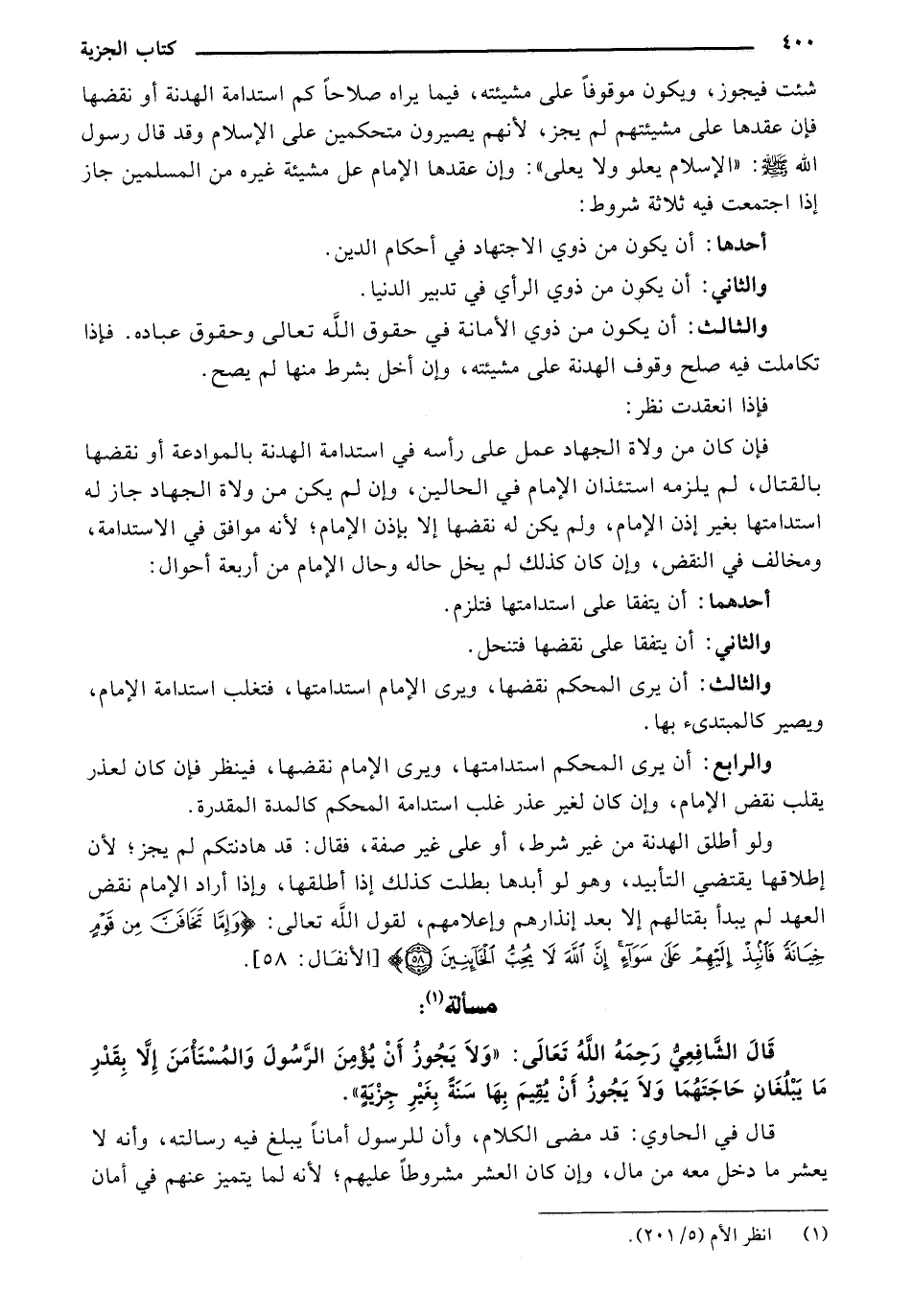 شئت فيجوز، ويكون موقوفًا على مشيئته، فيما يراه صلاحًا كم استدامة الهدنة أو نقضها فإن عقدها على مشيئتهم لم يجز، لأنهم يصيرون متحكمين على الإسلام وقد قال رسول الله صلى الله عليه وسلم: "الإسلام يعلو ولا يعلى": وإن عقدها الإمام عل مشيئته غيره من المسلمين جاز إذا اجتمعت فيه ثلاثة شروط: