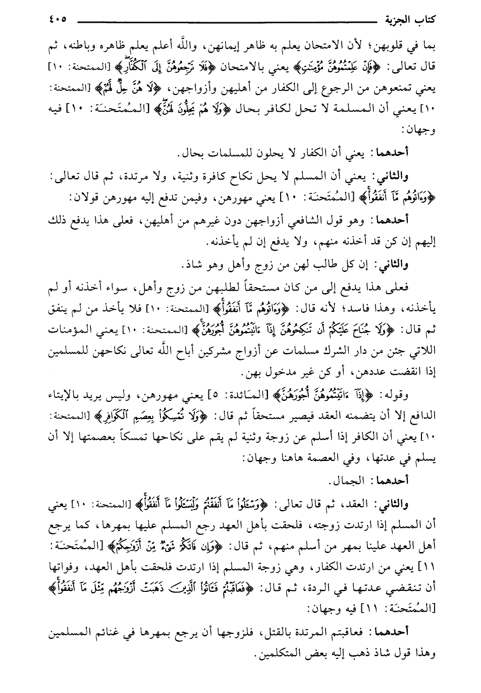 وقوله: {إذَا آتَيْتُمُوهُنَّ أُجُورَهُنَّ} [المائدة 5] يعني مهورهن، وليس يريد بالإيتاء الدافع إلا أن يتضمنه العقد فيصير مستحقًا ثم قال: {ولا تُمْسِكُوا بِعِصَمِ الكَوَافِرِ} [الممتحنة 10] يعني أن الكافر إذا أسلم عن زوجة وثنية لم يقم على نكاجها تمسكًا بعصمتها إلا أن يسلم في عدتها، وفي العصمة هاهنا وجهان: