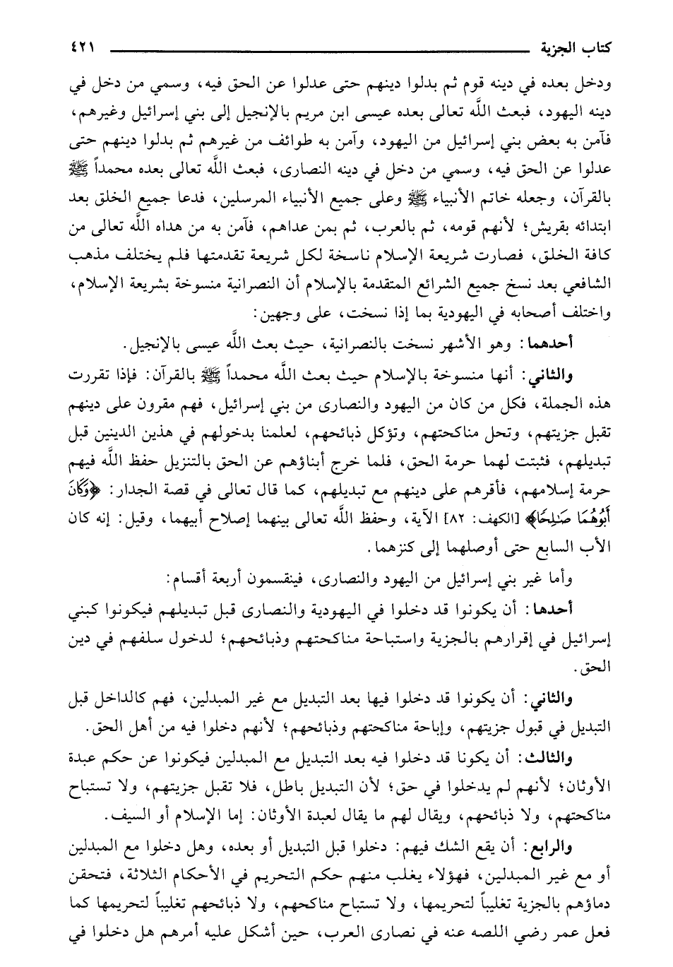 والرابع: أن يقع الشك فيهم: دخلوا قبل التبديل أو بعده، وخل دخلوا مع المبدلين أو مع غير المبدلين، فهؤلاء يغلب منهم حكم التحريم في الأحكام الثلاثة، فتحقن دماؤهم بالجزية تغليبًا لتحريمها، ولا تستباح مناكحتهم، ولا ذبائحهم تغليبًا لتحريمها كما فعل عمر رضي الله عنه في نصارى العرب، حين أشكل عليه أمرهم هل دخلوا في