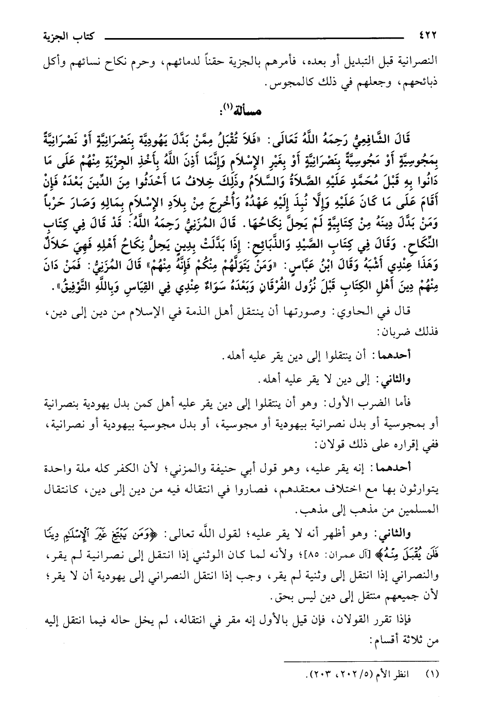 قال الشافعي رحمه الله تعالى: "فلا تقبل ممن بدل يهودية بنصرانية أو نصرانية بمجوسية أو مجوسية بنصرانية أو بغير الإسلام وإنما أذن الله بأخذ الجزية منهم على ما دانوا به قبل محمد عليه الصلاة والسلام وذلك خلاف ما أحدثوا من الدين بعده فإن أقام على ما كان عليه وإلا نبذ إليه عهده وأُخرج من بلاد الإسلام بماله وصار حربًا ومن بدل دينه من كتابية لم يحل نكاحها. قال المزني رحمه الله: قد قال في كتاب النكاح. وقال في كتاب الصيد والذبائح: إذا بدلت بدين يحل نكاح أهله فهي حلال وهذا عندي أشبه وقال ابن عباس: "ومن يتولهم منكم فإنه منهم" قال المزني: فمن دان منهم دين أهل الكتاب قبل نزول الفرقان وبعده سواء عندي في القياس وبالله التوفيق".