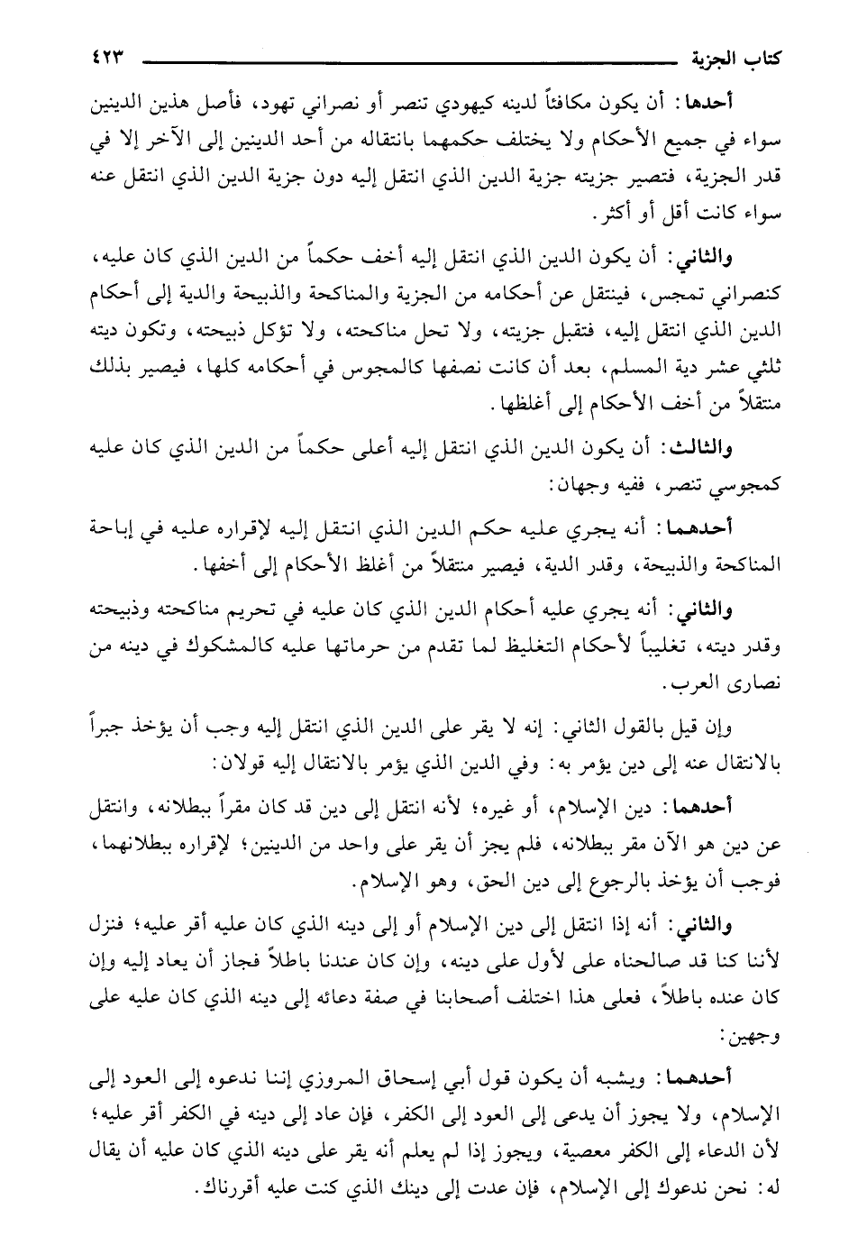 والثاني: أن يكون الدين الذي انتقل إليه أخف حكمًا من الدين الذي كان عليه، كنصراني تمجس، فينتقل عن أحكامه من الجزية والمناكحة والذبيحة والدية إلى أحكام الدين الذي انتقل إليه، فتقبل جزيته، ولا تحل مناكحته، ولا تؤكل ذبيحته، وتكون ديته ثلثي عشر دية المسلم، بعد أن كانت نصفها كالمجوس في أحكامه كلها، فيصير بذلك منتقلًا من أخف الأحكام إلى أغلظها.
