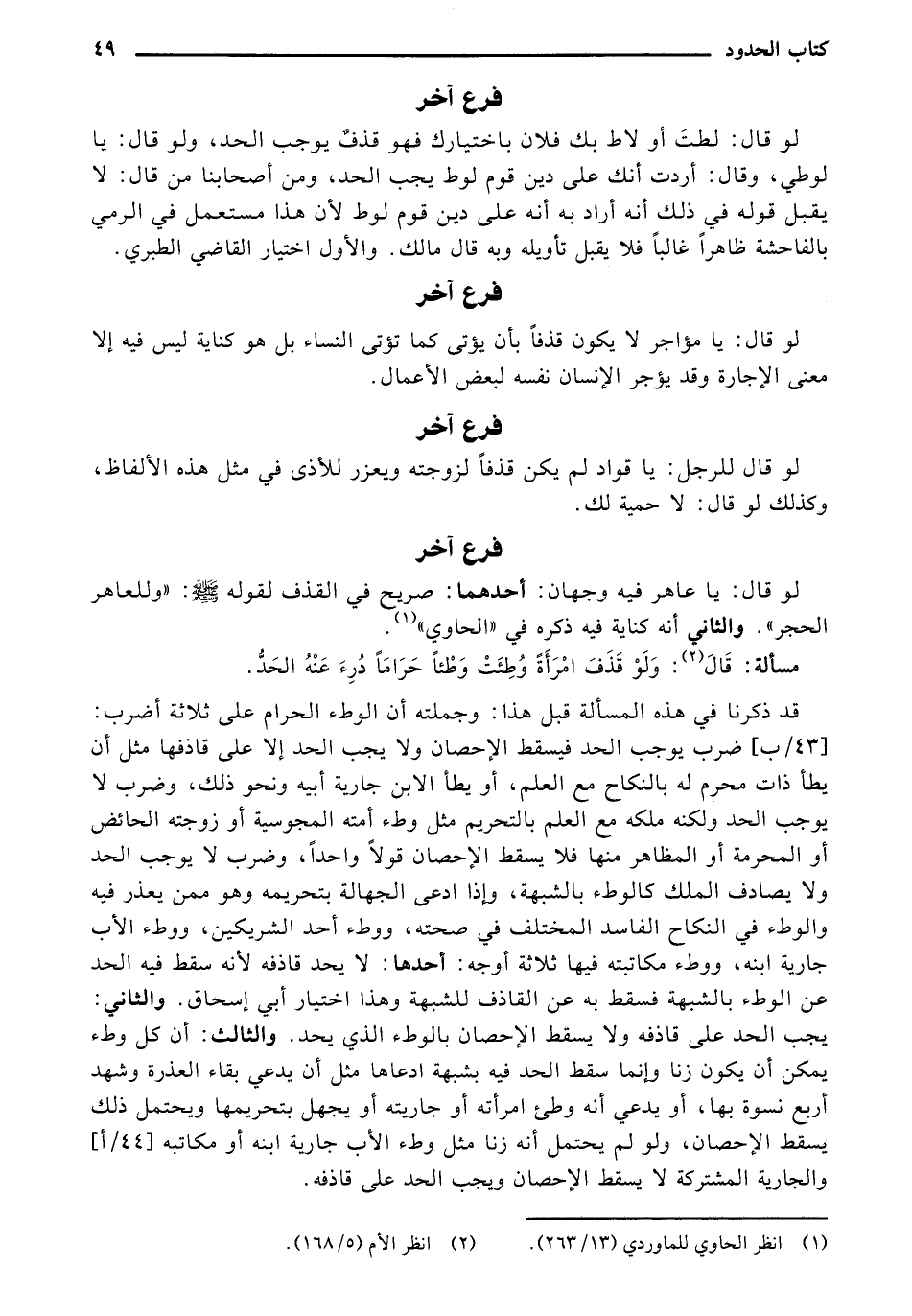 قد ذكرنا في هذه المسألة قبل هذا: وجملته أن الوطء الحرام على ثلاثة أضرب: [43/ب] ضرب يوجب الحد فيسقط الإحصان ولا يجب الحد إلا على قاذفها مثل أن يطأ ذات محرم له بالنكاح مع العلم، أو يطأ الابن جارية أبيه ونحو ذلك، وضرب لا يوجب الحد ولكنه ملكه مع العلم بالتحريم مثل وطء أمته المجوسية أو زوجته الحائض أو المحرمة أو المظاهر منها فلا يسقط الإحصان قولًا واحدًا، وضرب لا يوجب الحد ولا يصادف الملك كالوطء بالشبهة، وإذا ادعى الجهالة بتحريمه وهو ممن يعذر فيه والوطء في النكاح الفاسد المختلف في صحته، ووطء أحد الشريكين، ووطء الأب جارية ابنه، ووطء مكاتبته فيها ثلاثة أوجه: أحدها: لا يحد قاذفه لأنه سقط فيه الحد عن الوطء بالشبهة فسقط به عن القاذف للشبهة وهذا اختيار أبي إسحاق. والثاني: يجب الحد على قاذفه ولا يسقط الإحصان بالوطء الذي يحد. والثالث: أن كل وطء يمكن أن يكون زنا وإنما سقط الحد فيه بشبهة ادعاها مثل أن يدعي بقاء العذرة وشهد أربع نسوة بها، أو يدعي أنه وطئ امرأته أو جاريته أو يجهل بتحريمها ويحتمل ذلك يسقط الإحصان، ولو لم يحتمل أنه زنا مثل وطء الأب جارية ابنه أو (مكاتبته) [44/أ] والجارية المشتركة لا يسقط الإحصان ويجب الحد على قاذفه.