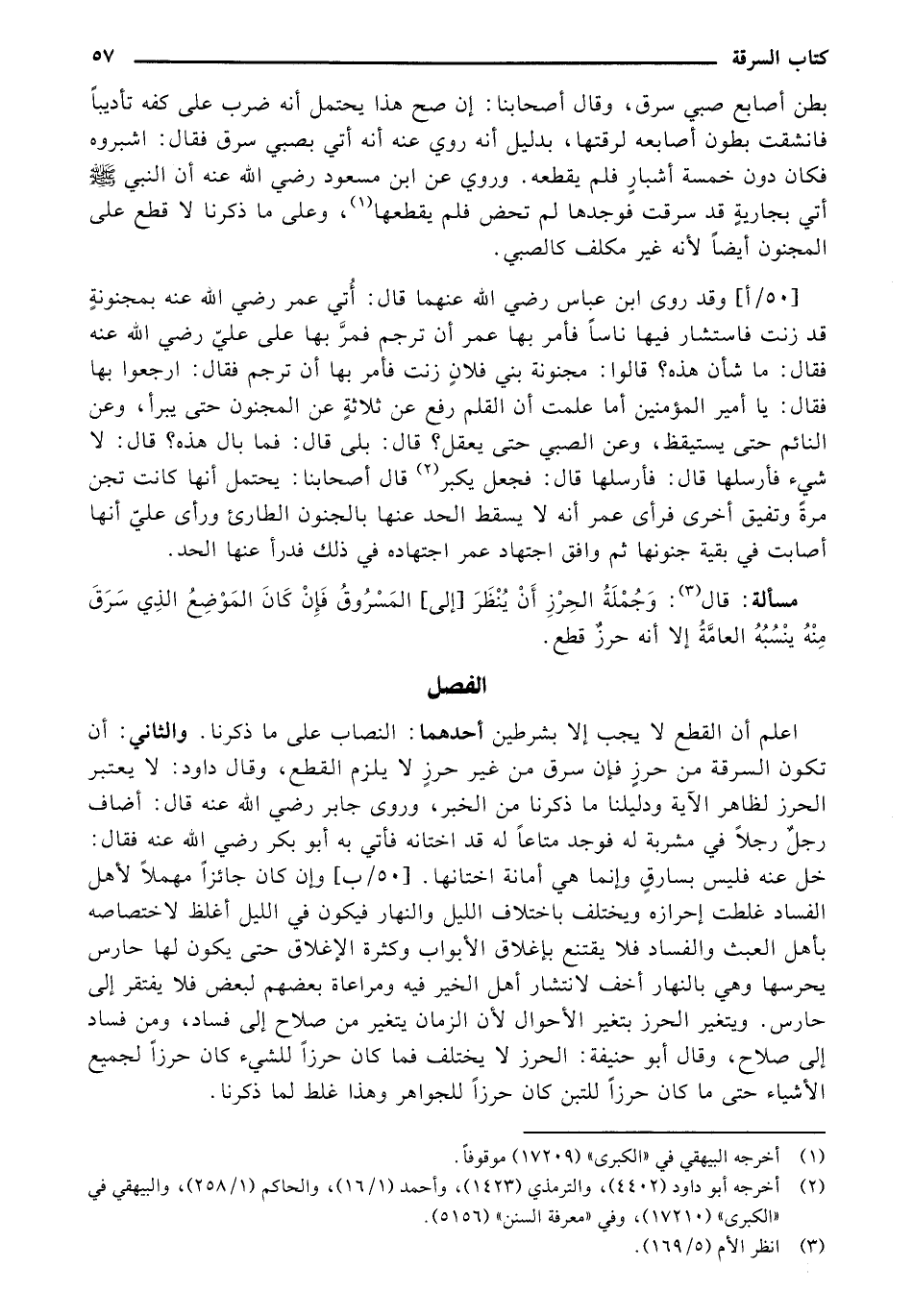 اعلم أن القطع لا يجب إلا بشرطين أحدهما: النصاب على ما ذكرنا. والثاني: أن تكون السرقة من حرزٍ فإن سرق من غير حرزٍ لا يلزم القطع، وقال داود: لا يعتبر الحرز لظاهر الآية ودليلنا ما ذكرنا من الخبر، وروى جابر رضي الله عنه قال: أضاف رجلٌ رجلًا في مشربة له فوجد متاعًا له قد اختانه فأتى به أبو بكر رضي الله عنه فقال: خل عنه فليس بسارقٍ وإنما هي أمانة اختانها. [50/ب] وإن كان جائزًا مهملًا لأهل الفساد غلطت إحرازه ويختلف باختلاف الليل والنهار فيكون في الليل أغلظ لاختصاصه بأهل العبث والفساد فلا يقتنع بإغلاق الأبواب وكثرة الإغلاق حتى يكون لها حارس يحرسها وهي بالنهار أخف لانتشار أهل الخير فيه ومراعاة بعضهم لبعض فلا يفتقر إلى حارس. ويتغير الحرز بتغير الأحوال لأن الزمان يتغير من صلاح إلى فساد، ومن فساد إلى صلاح، وقال أبو حنيفة: الحرز لا يختلف فما كان حرزًا للشيء كان حرزًا لجميع الأشياء حتى ما كان حرزًا للتبن كان حرزًا للجواهر وهذا غلط لما ذكرنا.
