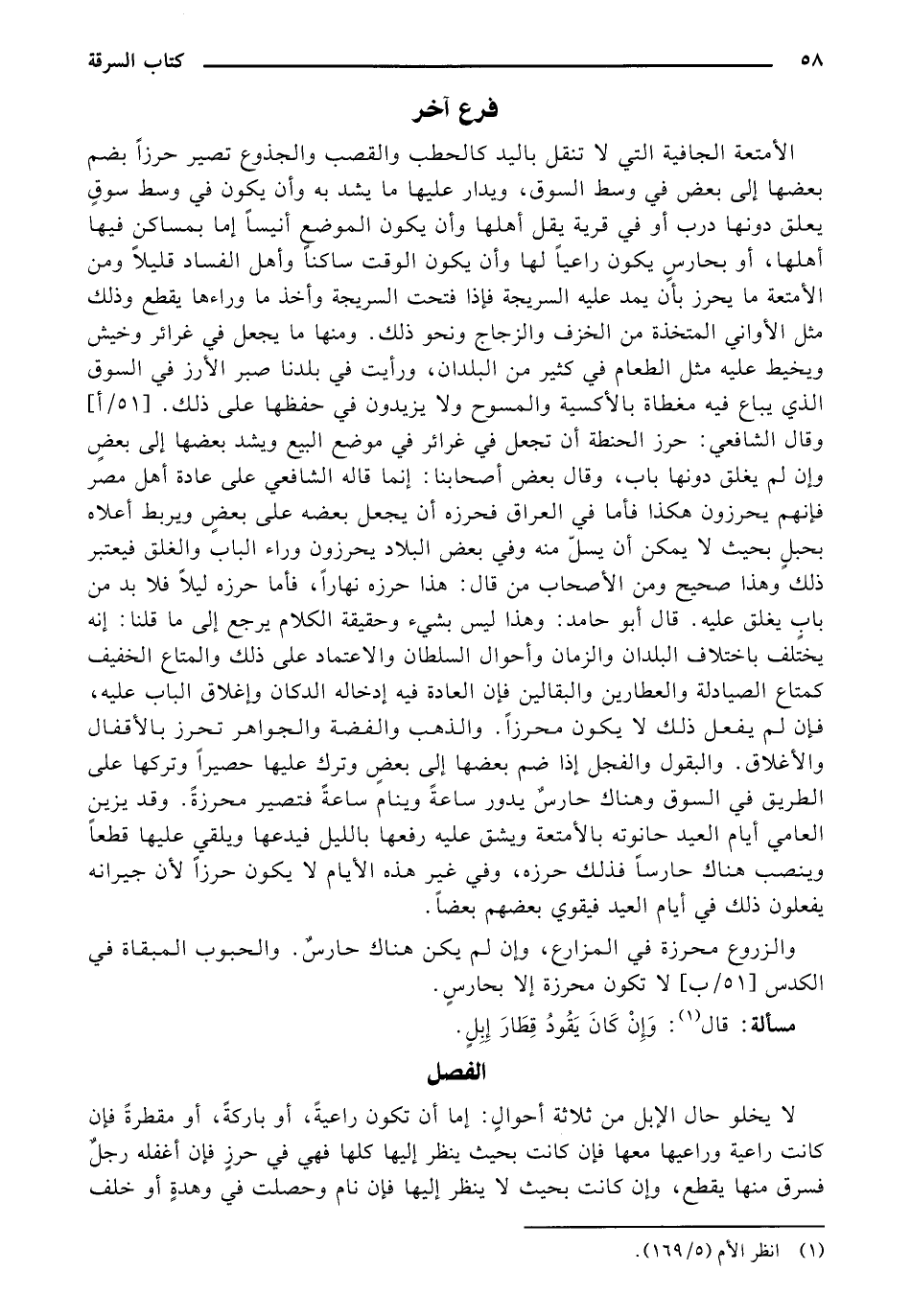 الأمتعة الجافية التي لا تنقل باليد كالحطب والقصب والجذوع تصير حرزًا بضم بعضها إلى بعض في وسط السوق، ويدار عليها ما يشد به وأن يكون في وسط سوقٍ يعلق دونها درب أو في قرية يقل أهلها وأن يكون الموضع أنيسًا إما بمساكن فيها أهلها، أو بحارسٍ يكون راعيًا لها وأن يكون الوقت ساكنًا وأهل الفساد قليلًا ومن الأمتعة ما يحرز بأن يمد عليه السريجة فإذا فتحت السريجة وأخذ ما وراءها يقطع وذلك مثل الأواني المتخذة من الخزف والزجاج ونحو ذلك. ومنها ما يجعل في غرائر وخيش ويخيط عليه مثل الطعام في كثير من البلدان، ورأيت في بلدنا صبر الأرز في السوق الذي يباع فيه مغطاة بالأكسية والمسوح ولا يزيدون في حفظها على ذلك. [51/أ] وقال الشافعي: حرز الحنطة أن تجعل في غرائر في موضع البيع ويشد بعضها إلى بعضٍ وإن لم يغلق دونها باب، وقال بعض أصحابنا: إنما قاله الشافعي على عادة أهل مصر فإنهم يحرزون هكذا فأما في العراق فحرزه أن يجعل بعضه على بعضٍ ويربط أعلاه بحبلٍ بحيث لا يمكن أن يسل منه وفي بعض البلاد يحرزون وراء الباب والغلق فيعتبر ذلك وهذا صحيح ومن الأصحاب من قال: هذا حرزه نهارًا، فأما حرزه ليلًا فلابد من بابٍ يغلق عليه. قال أبو حامد: وهذا ليس بشيء وحقيقة الكلام يرجع إلى ما قلنا: إنه يختلف باختلاف البلدان والزمان وأحوال السلطان والاعتماد على ذلك والمتاع الخفيف كمتاع الصيادلة والعطارين والبقالين فإن العادة فيه إدخاله الدكان وإغلاق الباب عليه، فإن لم يفعل ذلك لا يكون محرزًا. والذهب والفضة والجواهر تحرز بالأقفال والأغلاق. والبقول والفجل إذا ضم بعضها إلى بعضٍ وترك عليها حصيرًا وتركها على الطريق في السوق وهناك حارسٌ يدور ساعةً وينام ساعةً فتصير محرزةً. وقد يزين العامي أيام العيد حانوته بالأمتعة ويشق عليه رفعها بالليل فيدعها ويلقي عليها قطعًا وينصب هناك حارسًا فذلك حرزه، وفي غير هذه الأيام لا يكون حرزًا لأن جيرانه يفعلون ذلك في أيام العيد فيقوي بعضهم بعضًا.