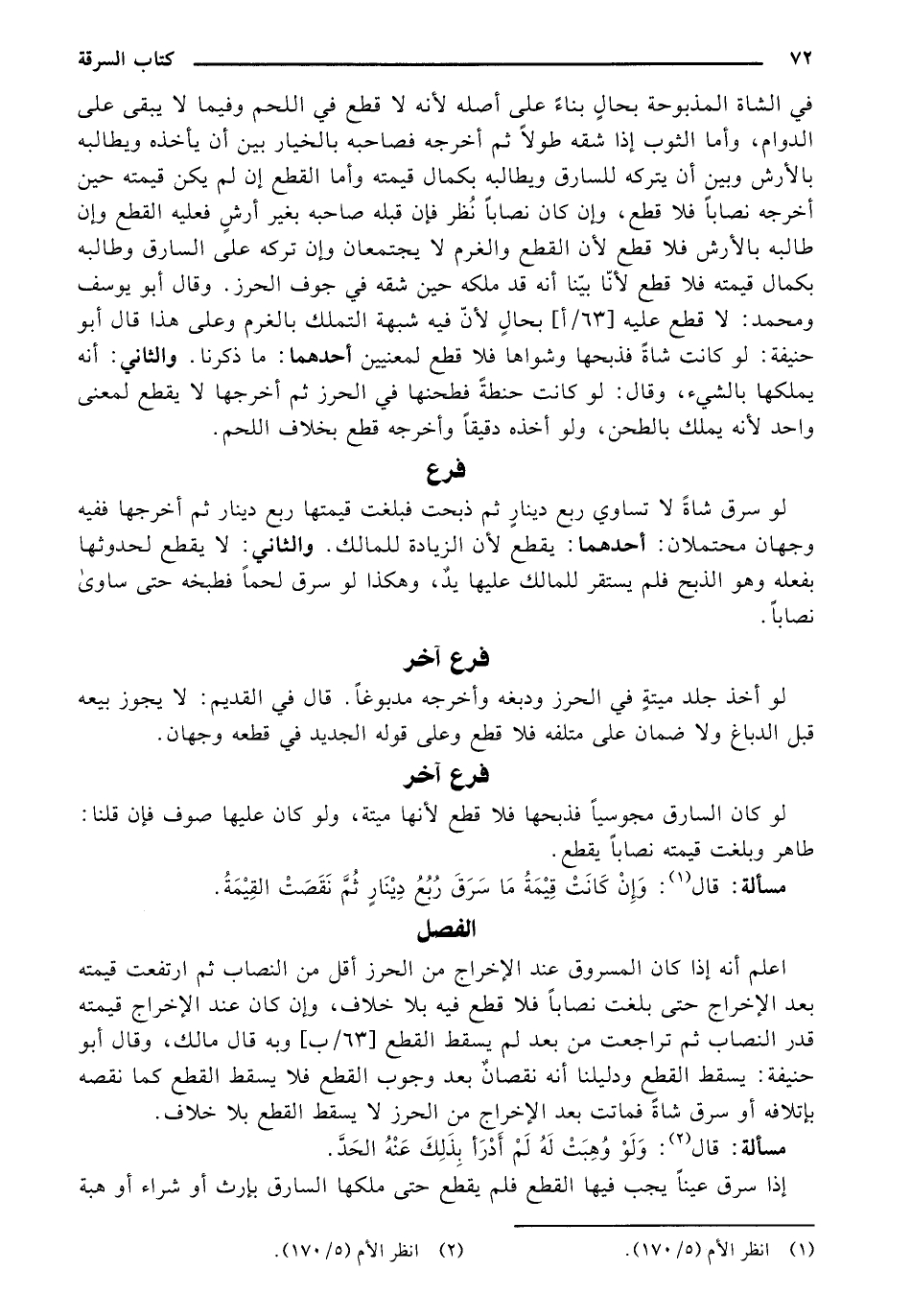في الشاة المذبوحة بحالٍ بناءً على أصله لأنه لا قطع في اللحم وفيما لا يبقى على الدوام، وأما الثوب إذا شقه طولًا ثم أخرجه فصاحبه بالخيار بين أن يأخذه ويطالبه بالأرش وبين أن يتركه للسارق ويطالبه بكمال قيمته وأما القطع إن لم يكن قيمته حين أخرجه نصابًا فلا قطع، وإن كان نصابًا نظر فإن قبله صاحبه بغير أرشٍ فعليه القطع وإن طالبه بالأرش فلا قطع لأن القطع والغرم لا يجتمعان وإن تركه على السارق وطالبه بكمال قيمته فلا قطع لأنا بينّا أنه قد ملكه حين شقه في جوف الحرز. وقال أبو يوسف ومحمد: لا قطع عليه [63/أ] بحالٍ لأن قطع لمعنيين أحدهما: ما ذكرنا. والثاني: أنه يملكها بالشيء، وقال: لو كانت حنطةً فطحنها في الحرز ثم أخرجها لا يقطع لمعنى واحد لأنه يملك بالطحن، ولو أخذه دقيقًا وأخرجه قطع بخلاف اللحم.