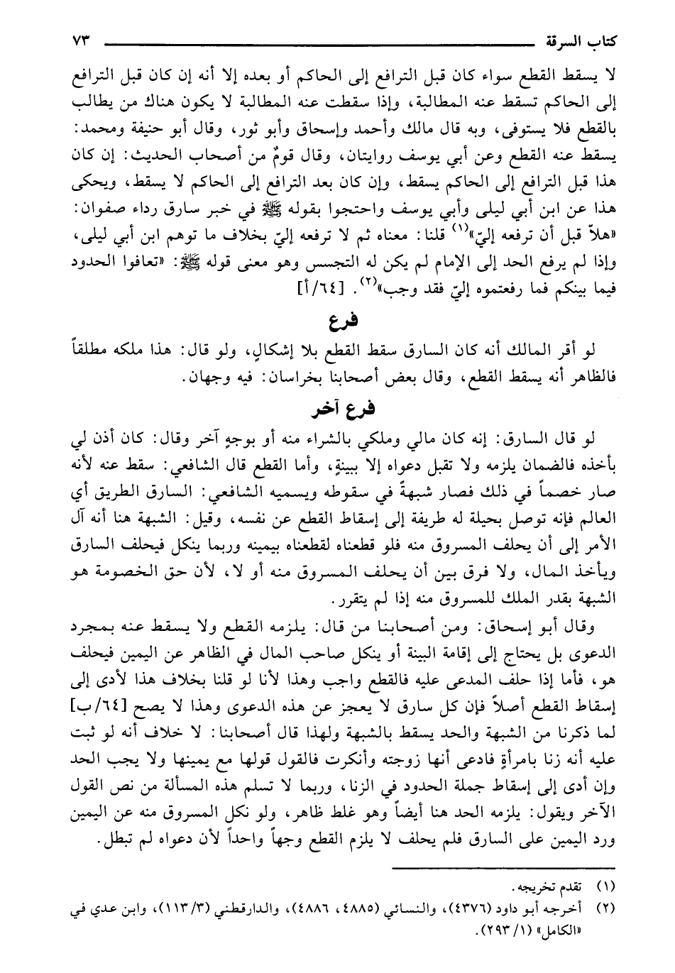 لو قال السارق: إنه كان مالي وملكي بالشراء منه أو بوجهٍ آخر وقال: كان أذن لي بأخذه فالضمان يلزمه ولا تقبل دعواه إلا ببينةٍ، وأما القطع قال الشافعي: سقط عنه لأنه صار خصمًا في ذلك فصار شبهةً في سقوطه ويسميه الشافعي: السارق (الطريف) أي العالم فإنه توصل بحيله له طريفة إلى إسقاط القطع عن نفسه، وقيل: الشبهة هنا أنه آل الأمر إلى أن يحلف المسروق منه فلو قطعناه لقطعناه بيمينه وربما ينكل فيحلف السارق ويأخذ المال، ولا فرق بين أن يحلف المسروق منه أو لا، لأن حق الخصومة هو الشبهة بقدر الملك للمسروق منه إذا لم يتقرر.