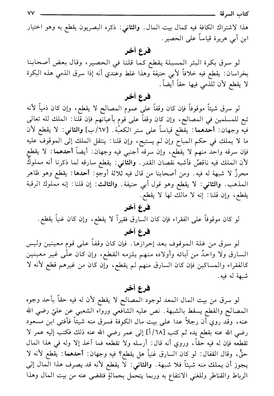 لو سرق من غلة الموقوف بعد إحرازها. فإن كان وقفًا على قوم معينين وليس السارق ولا واحدٌ من آبائه وأولاده منهم يلزمه القطع، وإن كان على غير معينين كالفقراء والمساكين فإن كان السارق منهم لم يقطع، وإن كان من غيرهم قطع لأنه لا شبهة له فيه.