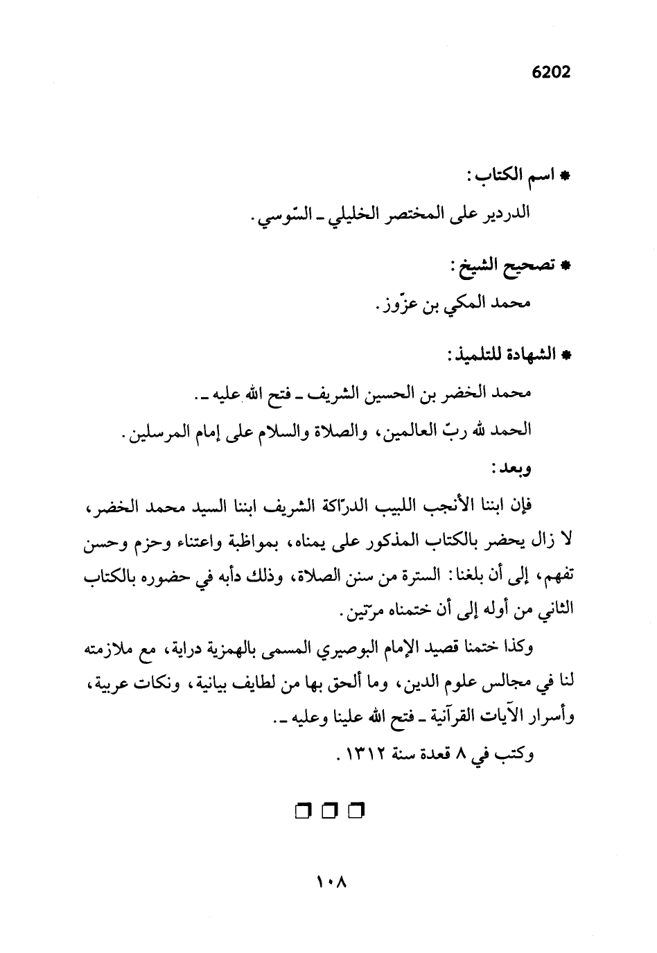 فإن ابننا الأنجب اللبيب الدرّاكة الشريف ابننا السيد محمد الخضر، لا زال يحضر بالكتاب المذكور على يمناه، بمواظبة واعتناء وحزم وحسن تفهم، إلى أن بلغنا: السترة من سنن الصلاة، وذلك دأبه في حضوره بالكتاب الثاني من أوله إلى أن ختمناه مرّتين.