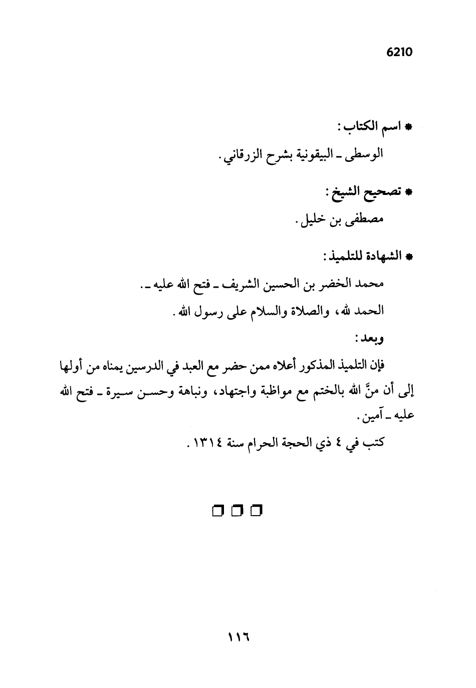 فإن التلميذ المذكور أعلاه ممن حضر مع العبد في الدرسين يمناه من أولها إلى أن منَّ الله بالختم مع مواظبة واجتهاد، ونباهة وحسن سيرة فتح الله عليه- آمين.