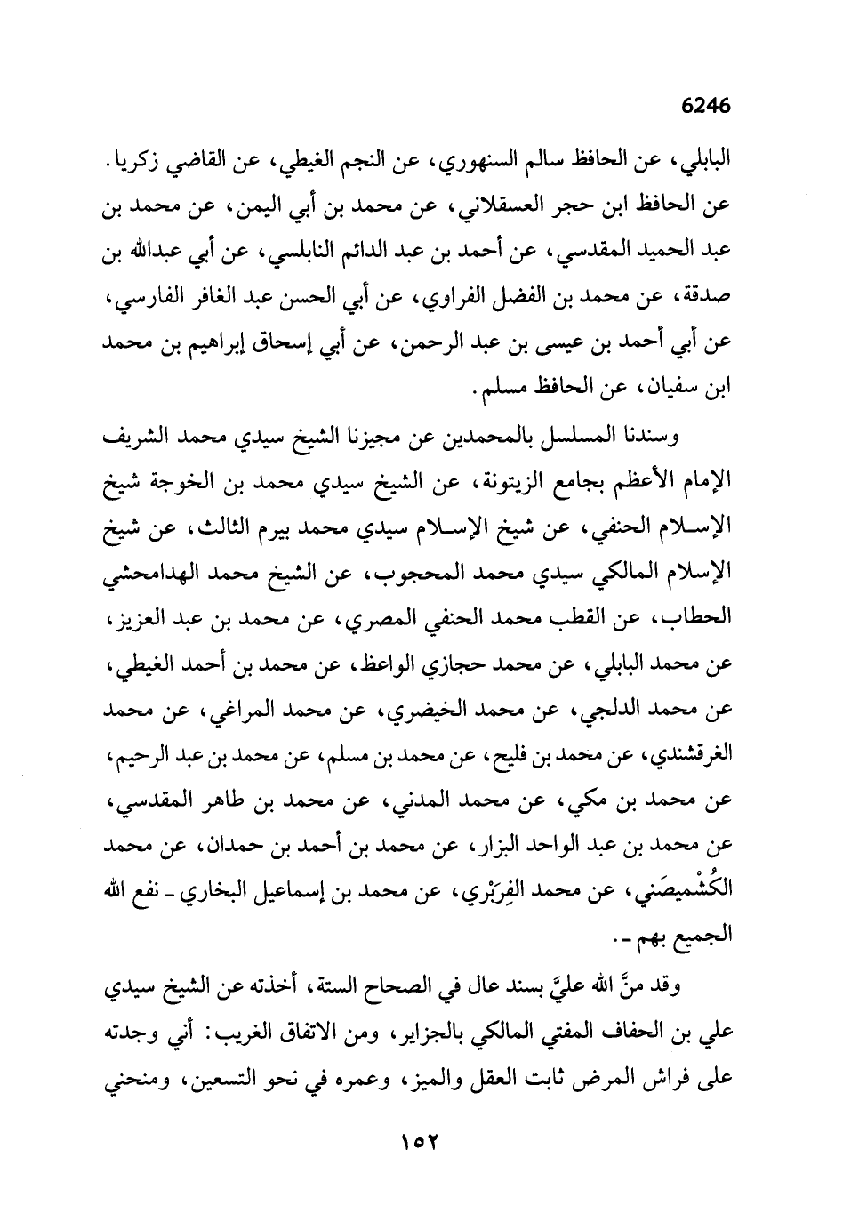 وقد منَّ الله عليَّ بسند عال في الصحاح الستة، أخذته عن الشيخ سيدي علي بن الحفاف المفتي المالكي بالجزاير، ومن الاتفاق الغريب: أني وجدته على فراش المرض ثابت العقل والميز، وعمره في نحو التسعين، ومنحني