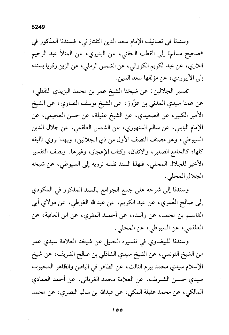 تفسير الجلالين: عن شيخنا الشيخ عمر بن محمد اليزيدي النفطي، عن عمنا سيدي المدني بن عزّوز، عن الشيخ يوسف الصاوي، عن الشيخ الأمير الكبير، عن الصعيدي، عن الشيخ عقيلة، عن حسن العجيمي، عن الإمام البابلي، عن سالم السنهوري، عن الشمس العلقمي، عن جلال الدين السيوطي، وهو مصنف النصف الأول من ذي الجلالين، وبهذا نروي تآليفه كلها؛ كالجامع الصغير، والإتقان، وكتاب الإعجاز، وغيرها. ونصف التفسير الأخير للجلال المحلي، فبهذا السند نفسه نرويه إلى السيوطي، عن شيخه الجلال المحلي.