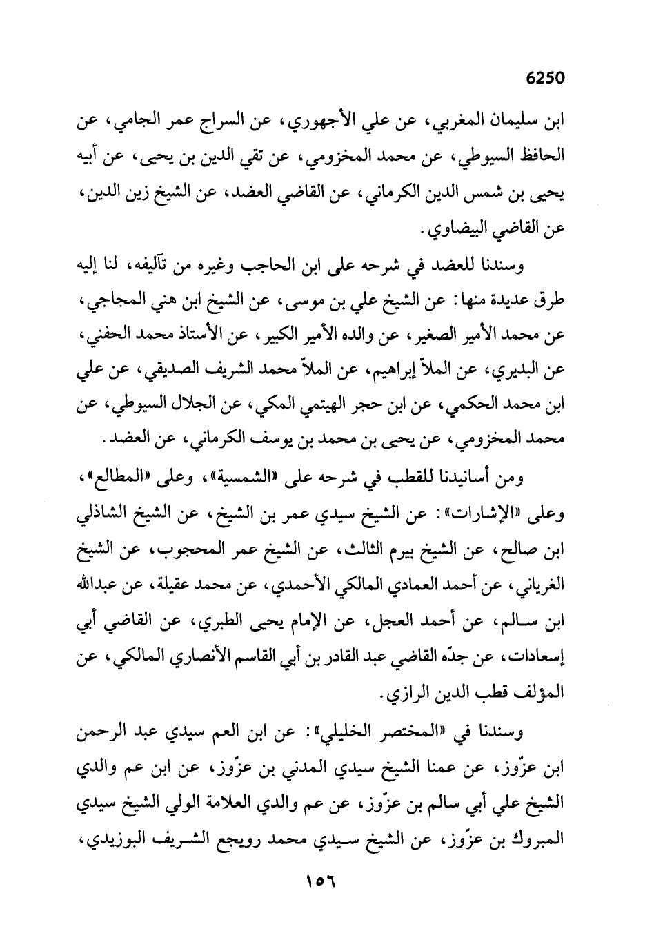 ومن أسانيدنا للقطب في شرحه على "الشمسية"، وعلى "المطالع"، وعلى "الإشارات": عن الشيخ سيدي عمر بن الشيخ، عن الشيخ الشاذلي ابن صالح، عن الشيخ بيرم الثالث، عن الشيخ عمر المحجوب، عن الشيخ الغرياني، عن أحمد العمادي المالكي الأحمدي، عن محمد عقيلة، عن عبد الله ابن سالم، عن أحمد العجل، عن الإمام يحيى الطبري، عن القاضي أبي إسعادات، عن جدّه القاضي عبد القادر بن أبي القاسم الأنصاري المالكي، عن المؤلف قطب الدين الرازي.