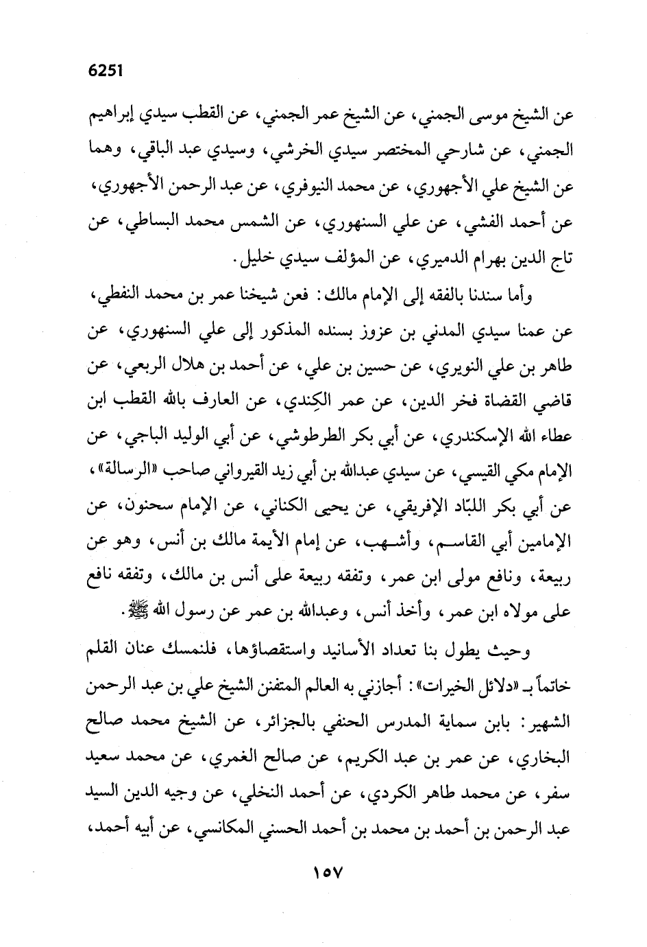 وحيث يطول بنا تعداد الأسانيد واستقصاؤها، فلنمسك عنان القلم خاتماً بـ "دلائل الخيرات": أجازني به العالم المتفنن الشيخ علي بن عبد الرحمن الشهير: بابن سماية المدرس الحنفي بالجزائر، عن الشيخ محمد صالح البخاري، عن عمر بن عبد الكريم، عن صالح الغمري، عن محمد سعيد سفر، عن محمد طاهر الكردي، عن أحمد النخلي، عن وجيه الدين السيد عبد الرحمن بن أحمد بن محمد بن أحمد الحسني المكانسي، عن أبيه أحمد،
