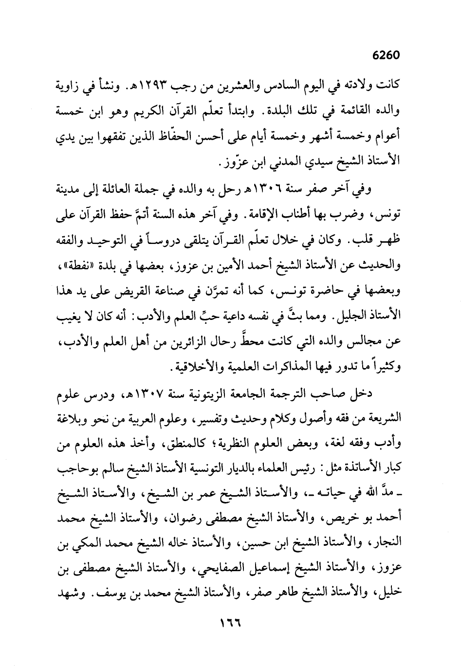 دخل صاحب الترجمة الجامعة الزيتونية سنة 1307 هـ، ودرس علوم الشريعة من فقه وأصول وكلام وحديث وتفسير، وعلوم العربية من نحو وبلاغة وأدب وفقه لغة، وبعض العلوم النظرية؛ كالمنطق، وأخذ هذه العلوم من كبار الأساتذة مثل: رئيس العلماء بالديار التونسية الأستاذ الشيخ سالم بوحاجب -مدَّ الله في حياته-، والأستاذ الشيخ عمر بن الشيخ، والأستاذ الشيخ أحمد بو خريص، والأستاذ الشيخ مصطفى رضوان، والأستاذ الشيخ محمد النجار، والأستاذ الشيخ ابن حسين، والأستاذ خاله الشيخ محمد المكي بن عزوز، والأستاذ الشيخ إسماعيل الصفايحي، والأستاذ الشيخ مصطفى بن خليل، والأستاذ الشيخ طاهر صفر، والأستاذ الشيخ محمد بن يوسف. وشهد