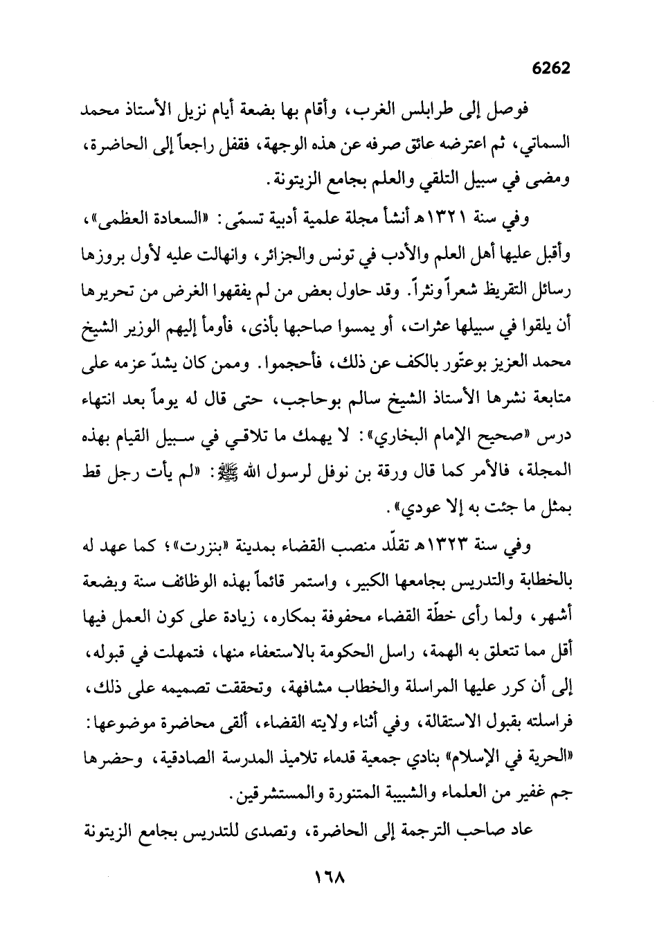 وفي سنة 1323 هـ تقلّد منصب القضاء بمدينة "بنزرت"؛ كما عهد له بالخطابة والتدريس بجامعها الكبير، واستمر قائماً بهذه الوظائف سنة وبضعة أشهر، ولما رأى خطّة القضاء محفوفة بمكاره، زيادة على كون العمل فيها أقل مما تتعلق به الهمة، راسل الحكومة بالاستعفاء منها، فتمهلت في قبوله، إلى أن كرر عليها المراسلة والخطاب مشافهة، وتحققت تصميمه على ذلك، فراسلته بقبول الاستقالة، وفي أثناء ولايته القضاء، ألقى محاضرة موضوعها: "الحرية في الإسلام" بنادي جمعية قدماء تلاميذ المدرسة الصادقية، وحضرها جم غفير من العلماء والشبيبة المتنورة والمستشرقين.