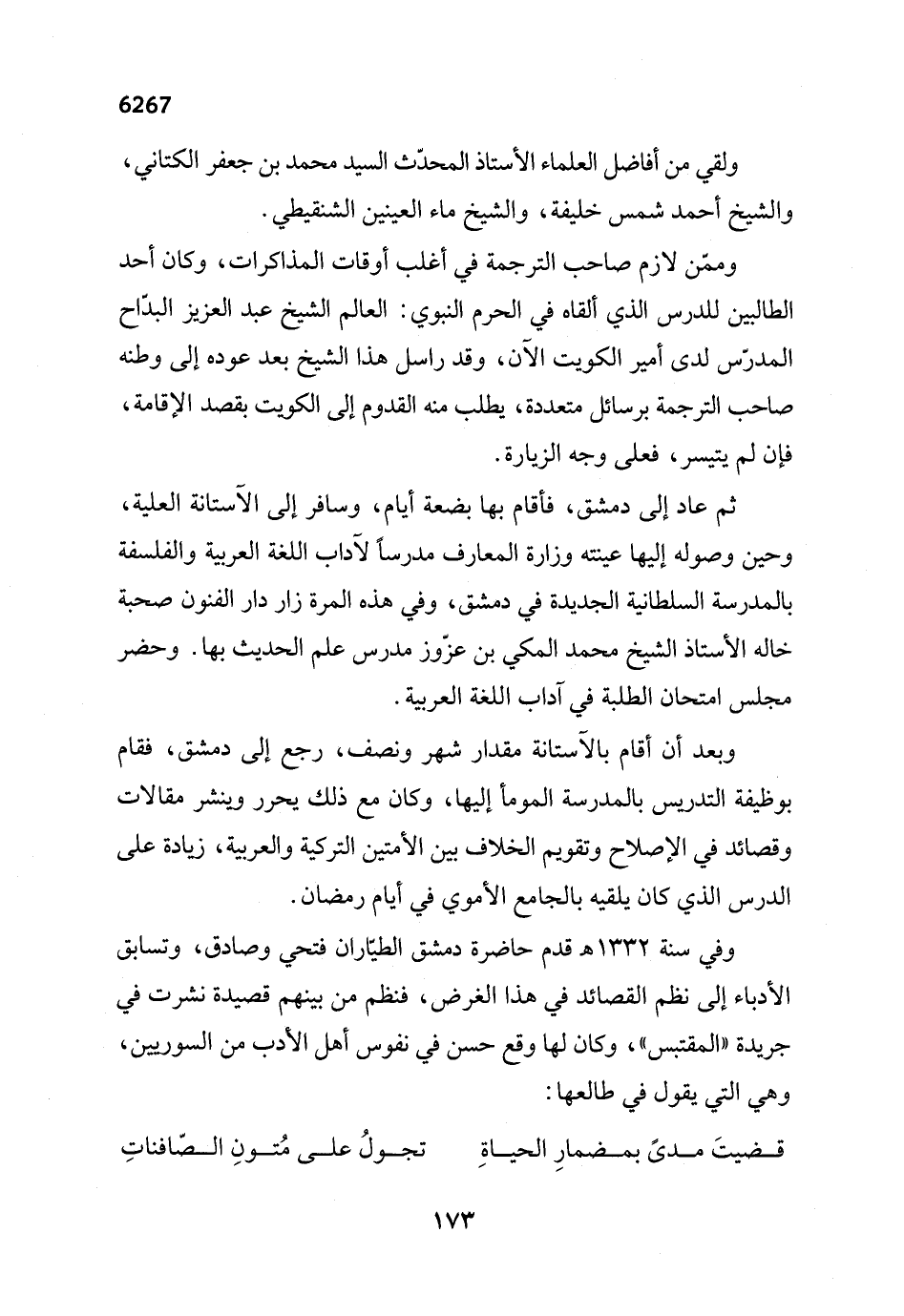 ثم عاد إلى دمشق، فأقام بها بضعة أيام، وسافر إلى الآستانة العلية، وحين وصوله إليها عينته وزارة المعارف مدرساً لآداب اللغة العربية والفلسفة بالمدرسة السلطانية الجديدة في دمشق، وفي هذه المرة زار دار الفنون صحبة خاله الأستاذ الشيخ محمد المكني بن عزّوز مدرس علم الحديث بها. وحضر مجلس امتحان الطلبة في آداب اللغة العربية.