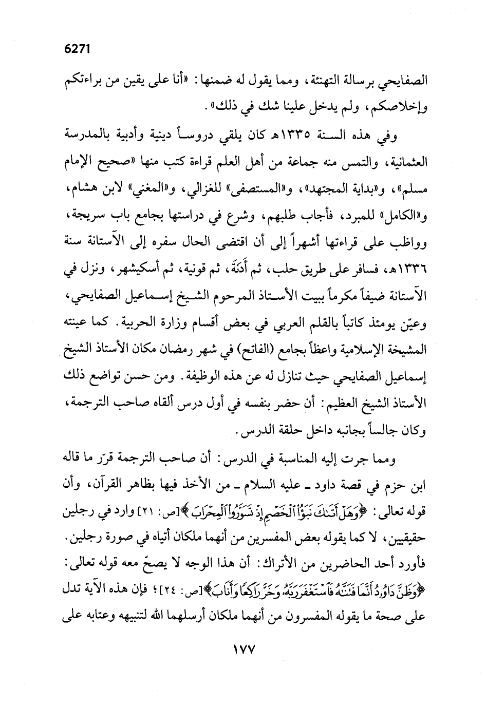 ومما جرت إليه المناسبة في الدرس: أن صاحب الترجمة قرّر ما قاله ابن حزم في قصة داود - عليه السلام - من الأخذ فيها بظاهر القرآن، وأن قوله تعالى: {وَهَلْ أَتَاكَ نَبَأُ الْخَصْمِ إِذْ تَسَوَّرُوا الْمِحْرَابَ} [ص: 21]، وارد في رجلين حقيقيين، لا كما يقوله بعض المفسرين من أنهما ملكان أتياه في سورة رجلين. فأورد أحد الحاضرين من الأتراك: أن هذا الوجه لا يصحّ معه قوله تعالى: {وَظَنَّ دَاوُودُ أَنَّمَا فَتَنَّاهُ فَاسْتَغْفَرَ رَبَّهُ وَخَرَّ رَاكِعًا وَأَنَابَ} [ص: 24]؛ فإن هذه الآية تدل على صحة ما يقوله المفسرون من أنهما ملكان أرسلهما الله لتنبيهه وعتابه على
