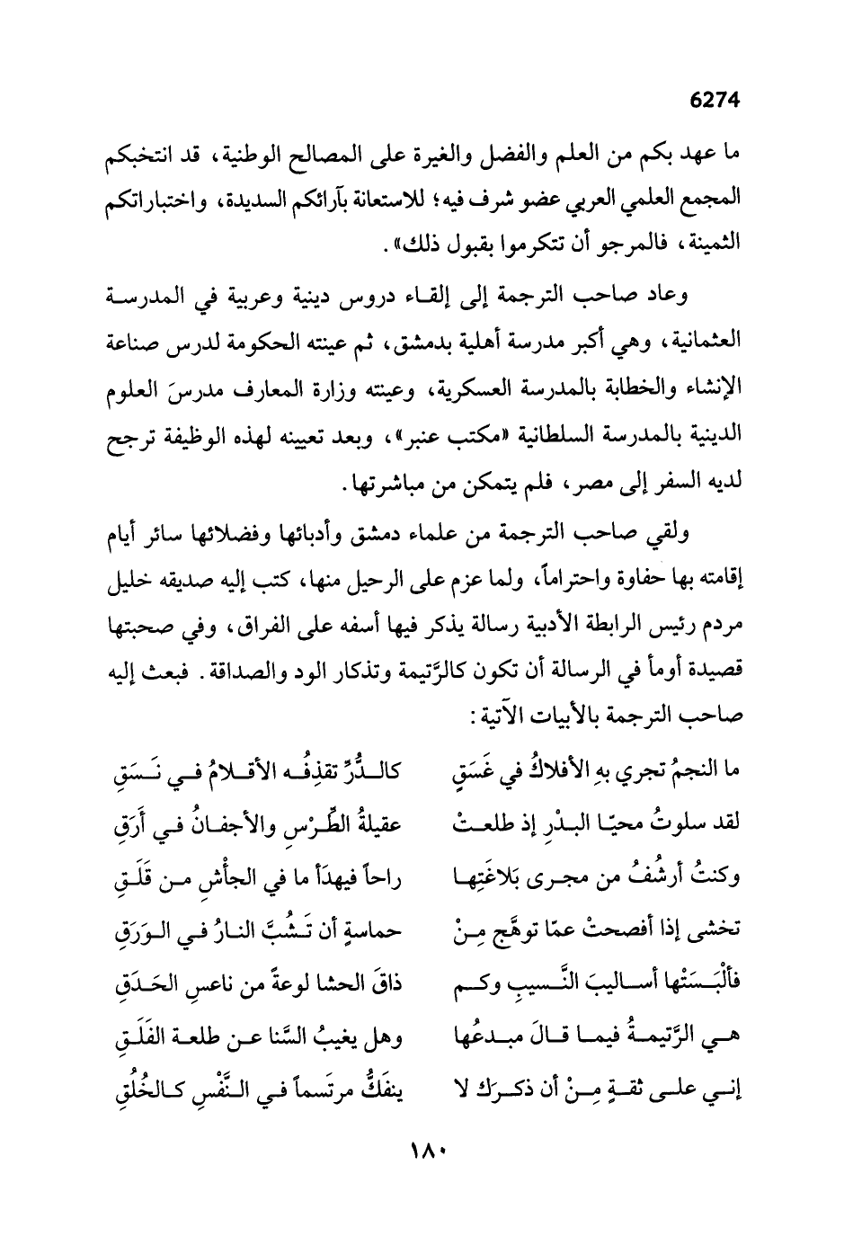 ولقي صاحب الترجمة من علماء دمشق وأدبائها وفضلائها سائر أيام إقامته بها حفاوة واحتراماً، ولما عزم على الرحيل منها، كتب إليه صديقه خليل مردم رئيس الرابطة الأدبية رسالة يذكر فيها أسفه على الفراق، وفي صحبتها قصيدة أومأ في الرسالة أن تكون كالرَّتيمة وتذكار الود والصداقة. فبعث إليه صاحب الترجمة بالأبيات الآتية: