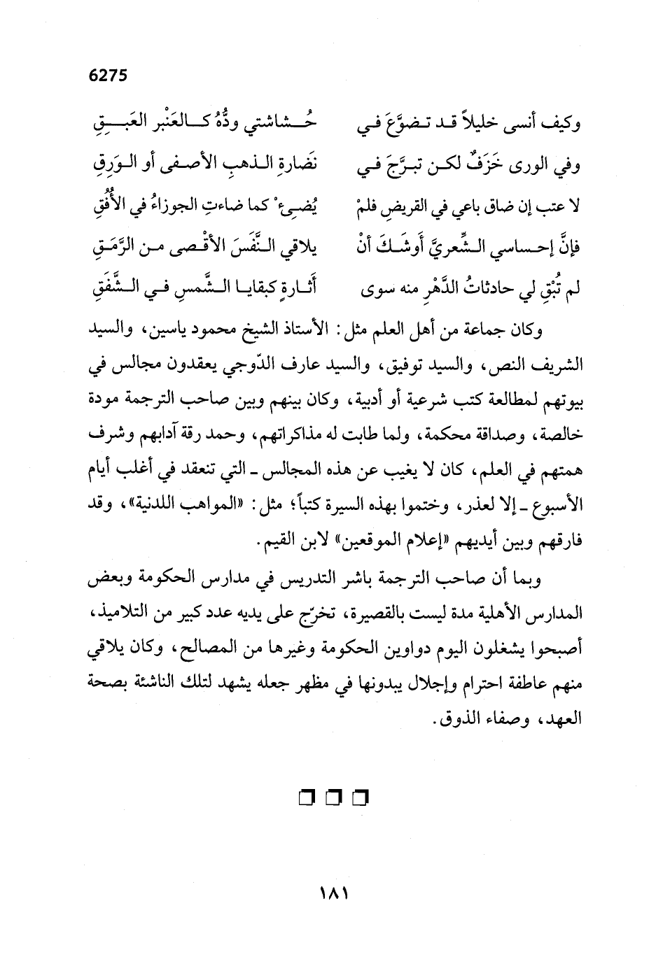 وكان جماعة من أهل العلم مثل: الأستاذ الشيخ محمود ياسين، والسيد الشريف النص، والسيد توفيق، والسيد عارف الدّوجي يعقدون مجالس في بيوتهم لمطالعة كتب شرعية أو أدبية، وكان بينهم وبين صاحب الترجمة مودة خالصة، وصداقة محكمة، ولما طابت له مذاكراتهم، وحمد رقة آدابهم وشرف همتهم في العلم، كان لا يغيب عن هذه المجالس -التي تنعقد في أغلب أيام الأسبوع- إلا لعذر، وختموا بهذه السيرة كتباً؛ مثل: "المواهب اللدنية"، وقد فارقهم وبين أيديهم "إعلام الموقعين" لابن القيم.
