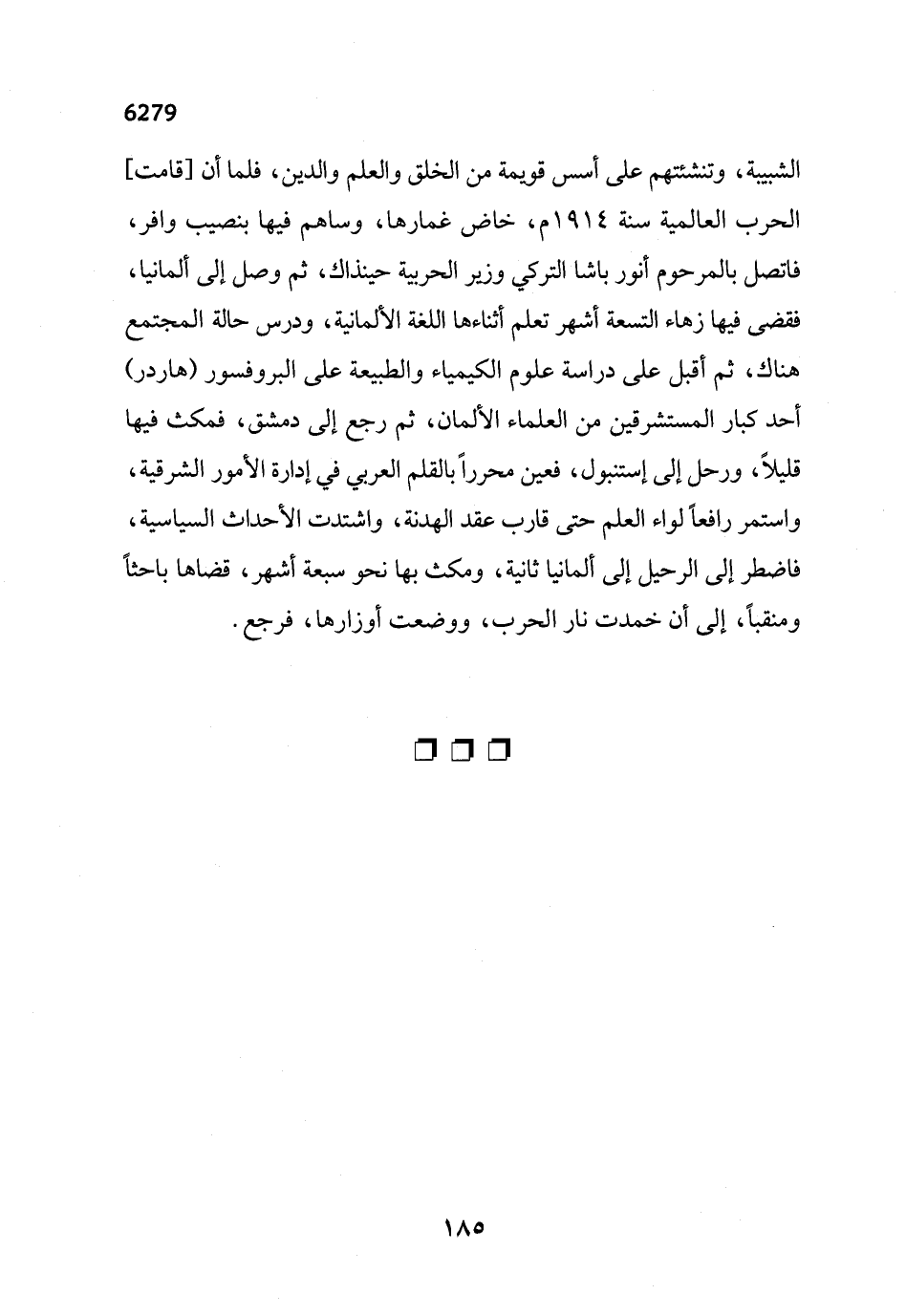 الشبيبة، وتنشئتهم على أسس قويمة من الخلق والعلم والدين، فلما أن [قامت] الحرب العالمية سنة 1914 م، خاض غمارها، وساهم فيها بنصيب وافر، فاتصل بالمرحوم أنور باشا التركي وزير الحربية حينذاك، ثم وصل إلى ألمانيا، فقضى فيها زهاء التسعة أشهر تعلم أثناءها اللغة الألمانية، ودرس حالة المجتمع هناك، ثم أقبل على دراسة علوم الكيمياء والطبيعة على البروفسور (هاردر) أحد كبار المستشرقين من العلماء الألمان، ثم رجع إلى دمشق، فمكث فيها قليلاً، ورحل إلى إستنبول، فعين محرراً بالقلم العربي في إدارة الأمور الشرقية، واستمر رافعاً لواء العلم حتى قارب عقد الهدنة، واشتدت الأحداث السياسية، فاضطر إلى الرحيل إلى ألمانيا ثانية، ومكث بها نحو سبعة أشهر، قضاها باحثاً ومنقباً، إلى أن خمدت نار الحرب، ووضعت أوزارها، فرجع.