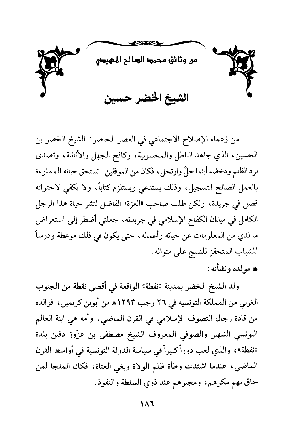 من زعماء الإصلاح الاجتماعي في العصر الحاضر: الشيخ الخضر بن الحسين، الذي جاهد الباطل والمحسوبية، وكافح الجهل والأنانية، وتصدى لرد الظلم ودحضه أينما حلَّ وارتحل، فكان من الموفقين. تستحق حياته المملوءة بالعمل الصالح التسجيل، وذلك يستدعي ويستلزم كتاباً، ولا يكفي لاحتوائه فصل في جريدة، ولكن طلب صاحب "العزة" الفاضل لنشر حياة هذا الرجل الكامل في ميدان الكفاح الإسلامي في جريدته، جعلني أضطر إلى استعراض ما لدي من المعلومات عن حياته وأعماله، حتى يكون في ذلك موعظة ودرساً للشباب المتحفز للنسج على منواله.