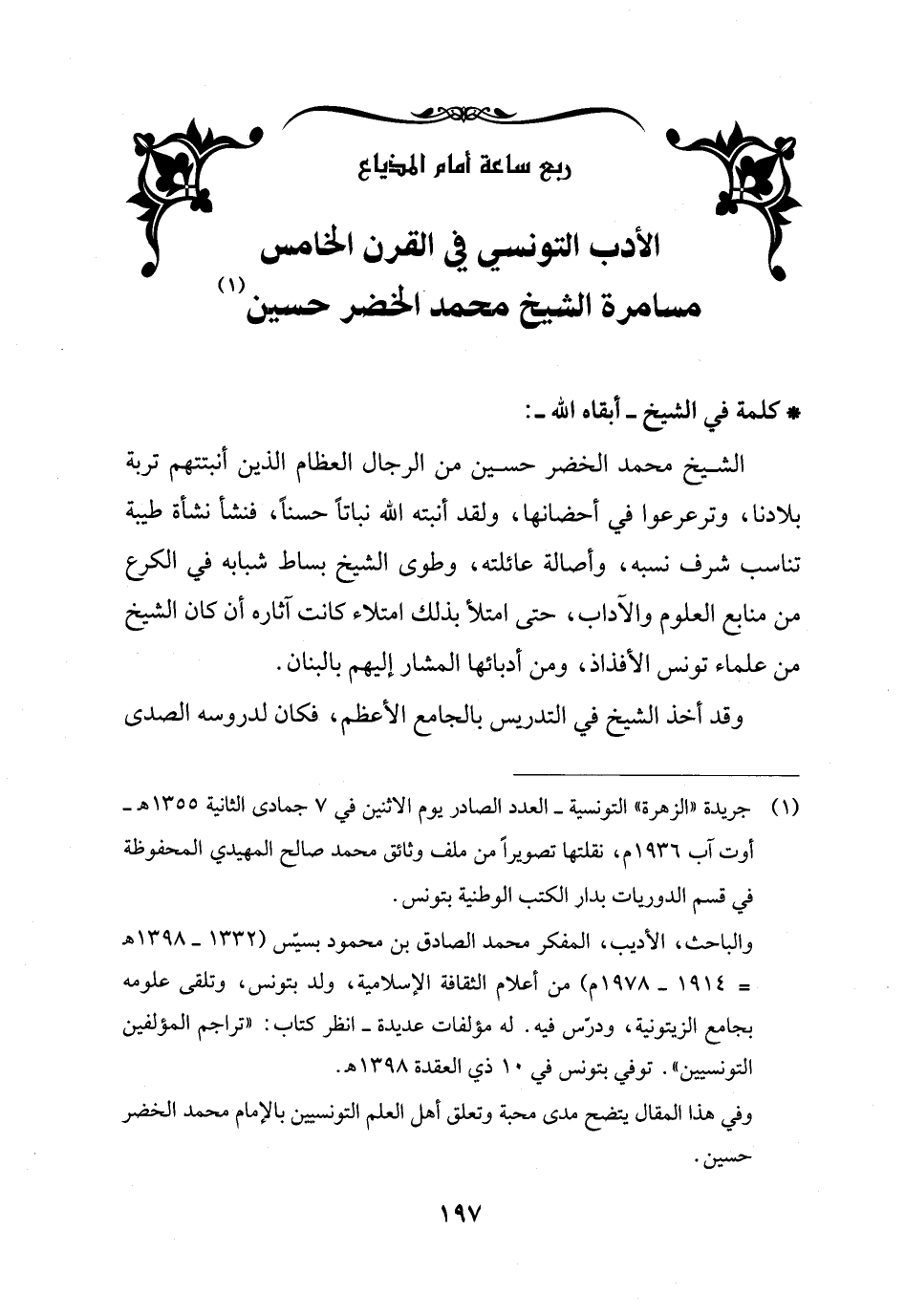 الأدب التونسي في القرن الخامس مسامرة الشيخ محمد الخضر حسين (¬1)