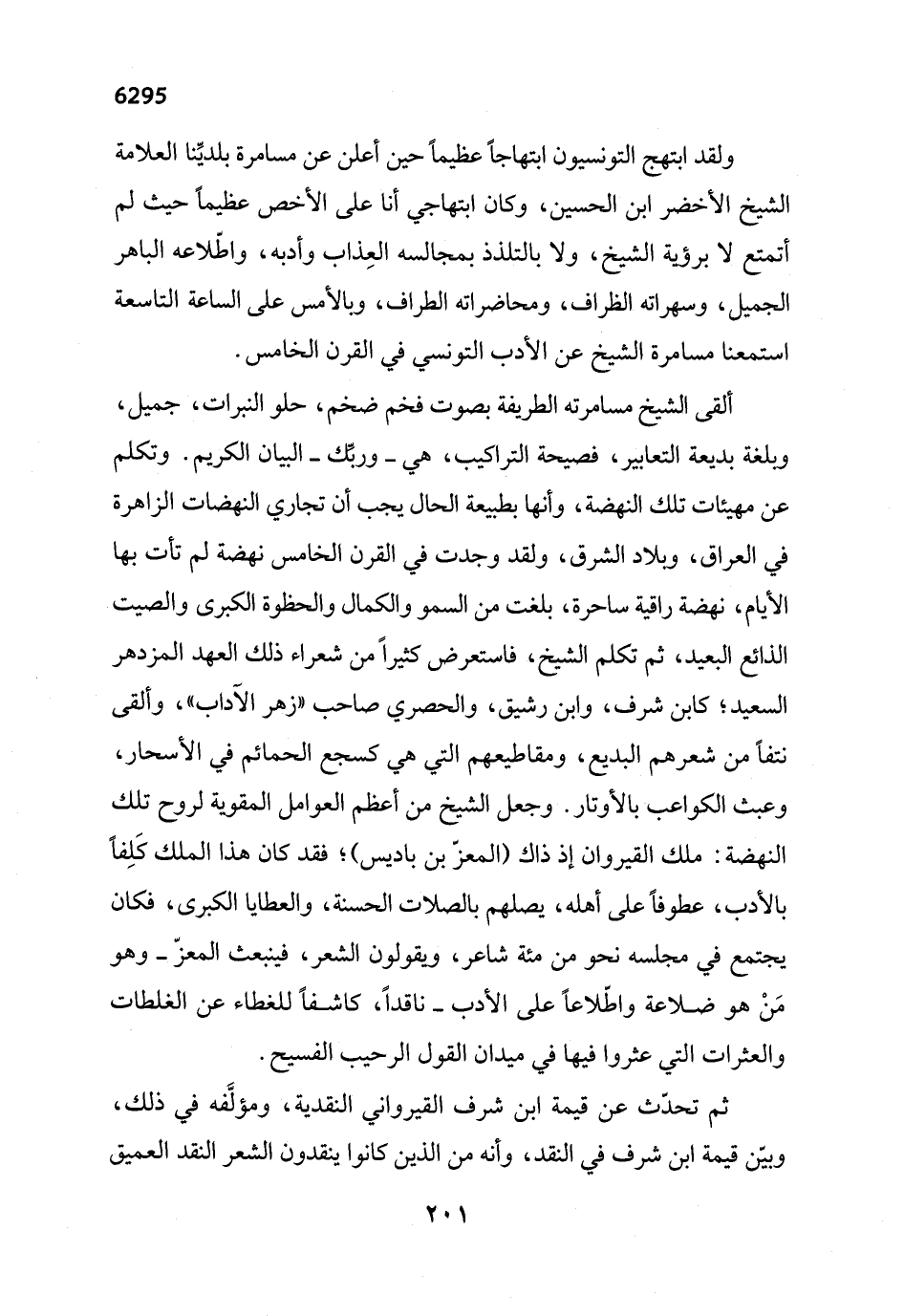 ولقد ابتهج التونسيون ابتهاجاً عظيماً حين أعلن عن مسامرة بلديِّنا العلامة الشيخ الأخضر ابن الحسين، وكان ابتهاجي أنا على الأخص عظيماً حيث لم أتمتع لا برؤية الشيخ، ولا بالتلذذ بمجالسه العِذاب وأدبه، واطّلاعه الباهر الجميل، وسهراته الظراف، ومحاضراته الطراف، وبالأمس على الساعة التاسعة استمعنا مسامرة الشيخ عن الأدب التونسي في القرن الخامس.