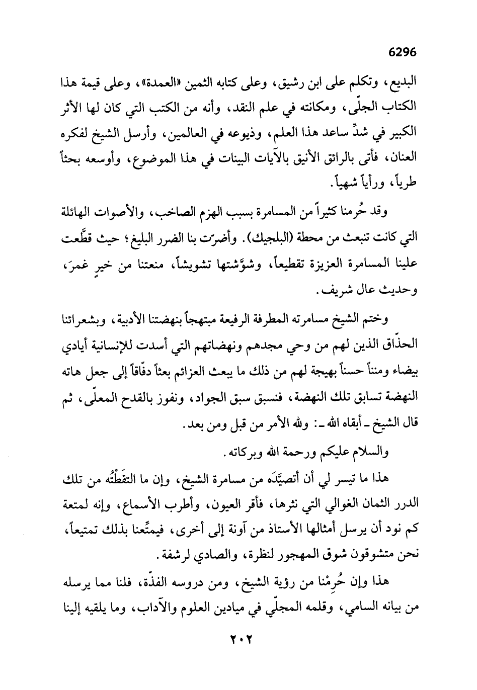 هذا وإن حُرِمْنا من رؤية الشيخ، ومن دروسه الفذّة، فلنا مما يرسله من بيانه السامي، وقلمه المجلّي في ميادين العلوم والآداب، وما يلقيه إلينا