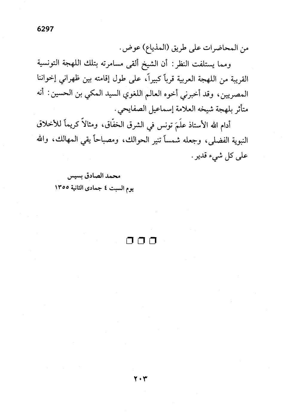 أدام الله الأستاذ علَمَ تونس في الشرق الخفّاق، ومثالاً كريماً للأخلاق النبوية الفضلى، وجعله شمساً تنير الحوالك، ومصباحاً يقي المهالك، والله على كل شيء قدير.