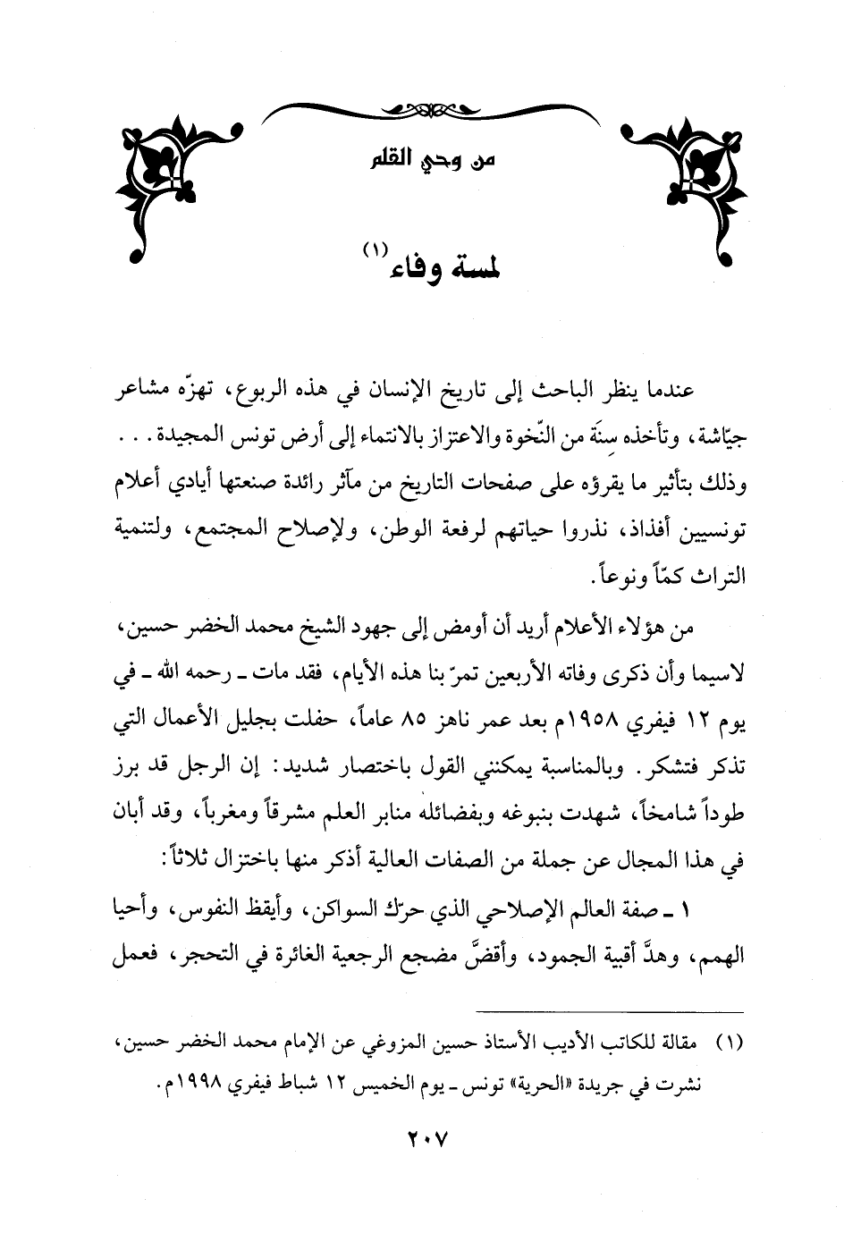 (¬1) مقالة للكاتب الأديب الأستاذ حسين المزوغي عن الإمام محمد الخضر حسين، نشرت في جريدة "الحرية" تونس - يوم الخميس 12 شباط فيفري 1998 م.