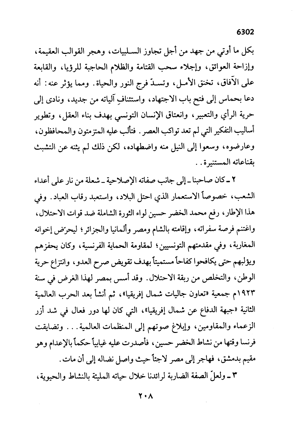 2 - كان صاحبنا -إلى جانب صفاته الإصلاحية- شعلة من نار على أعداء الشعب، خصوصاً الاستعمار الذي احتل البلاد، واستعبد رقاب العباد. وفي هذا الإطار، رفع محمد الخضر حسين لواء الثورة الشاملة ضد قوات الاحتلال، واغتنم فرصة سفراته، وإقامته بالشام ومصر وألمانيا والجزائر؛ ليحرّض إخوانه المغاربة، وفي مقدمتهم التونسيين؛ لمقاومة الحماية الفرنسية، وكان يحفزهم ويؤلبهم حتى يكافحوا كفاحاً مستميتاً بهدف تقويض صرح العدو، وانتزاع حرية الوطن، والتخلص من ربقة الاحتلال. وقد أسس بمصر لهذا الغرض في سنة 1923 م جمعية "تعاون جاليات شمال إفريقيا"، ثم أنشأ بعد الحرب العالمية الثانية "جبهة الدفاع عن شمال إفريقيا"، التي كان لها دور فعال في شد أزر الزعماء والمقاومين، وإبلاع صوتهم إلى المنظمات العالمية. . . وتضايقت فرنسا وقتها من نشاط الخضر حسين، فأصدرت عليه غيابياً حكماً بالإعدام وهو مقيم بدمشق، فهاجر إلى مصر لاجئاً حيث واصل نضاله إلى أن مات.
