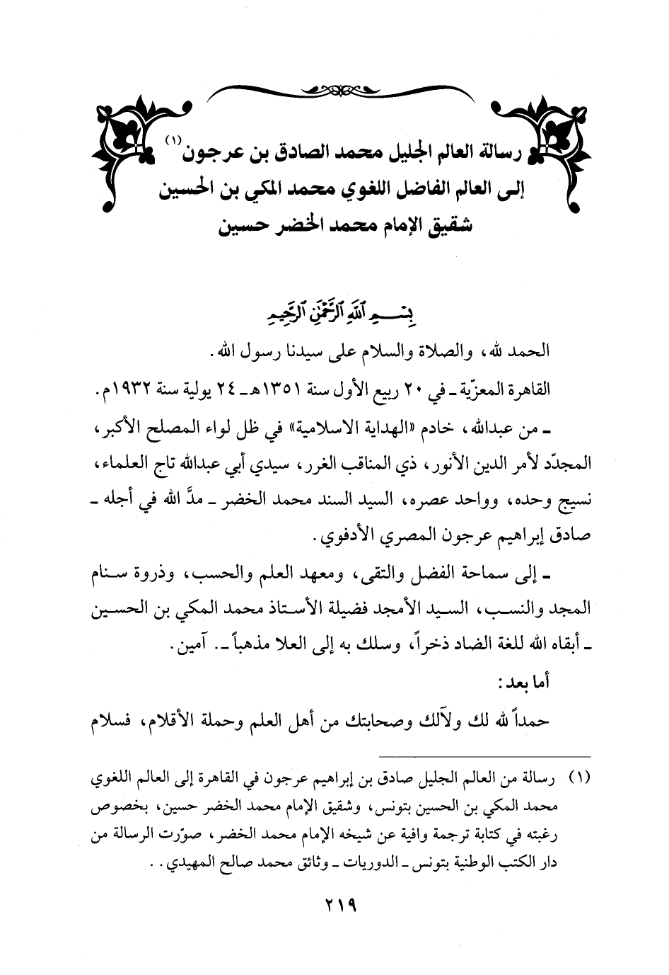 رسالة العالم الجليل محمد الصادق بن عرجون (¬1) إلى العالم الفاضل اللغوي محمد المكي بن الحسين شقيق الإمام محمد الخضر حسين