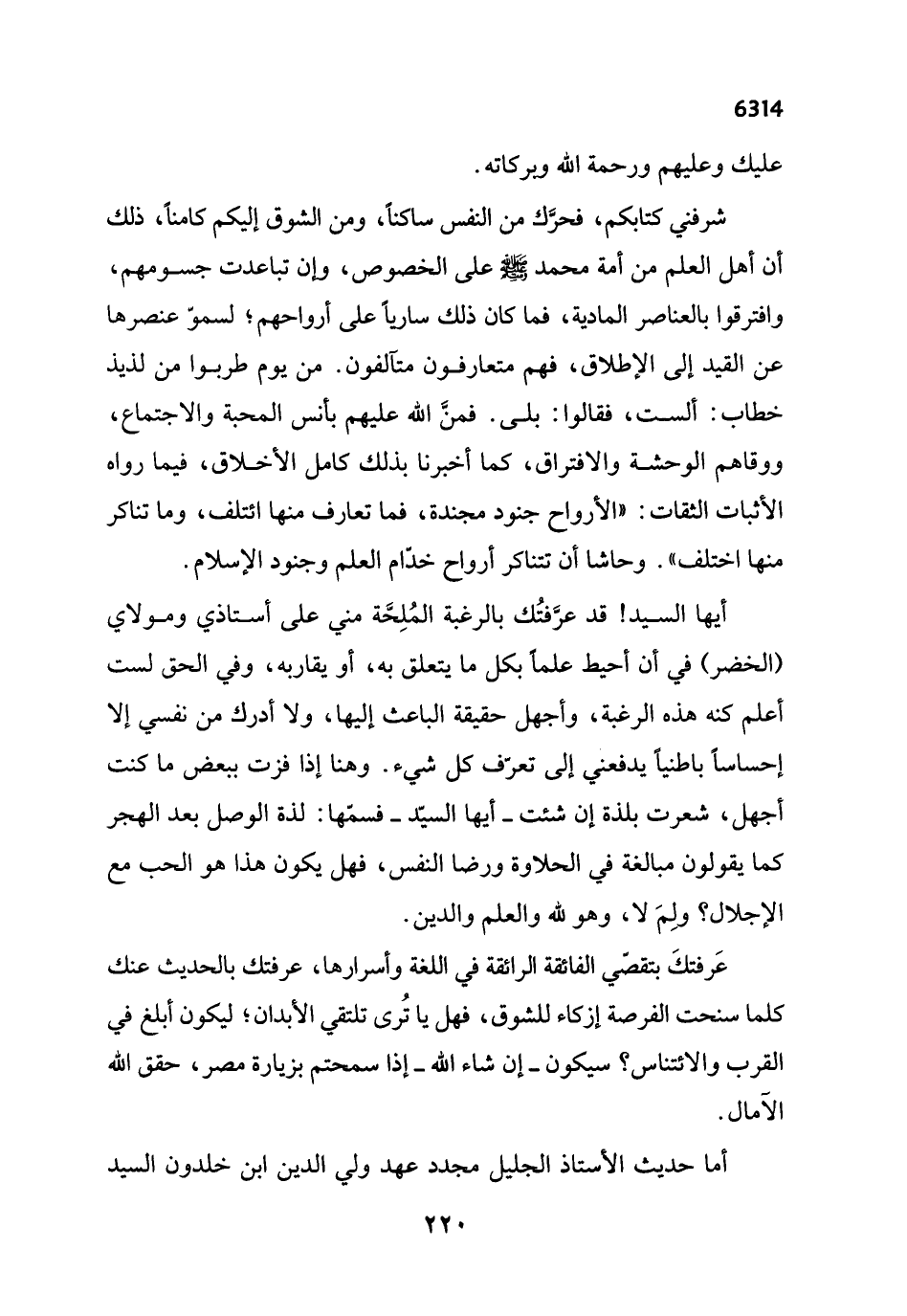 شرفني كتابكم، فحرَّك من النفس ساكناً، ومن الشوق إليكم كامناً، ذلك أن أهل العلم من أمة محمد - صلى الله عليه وسلم - على الخصوص، وإن تباعدت جسومهم، وافترقوا بالعناصر المادية، فما كان ذلك سارياً على أرواحهم؛ لسموّ عنصرها عن القيد إلى الإطلاق، فهم متعارفون متآلفون. من يوم طربوا من لذيذ خطاب: ألست، فقالوا: بلى. فمنَّ الله عليهم بأنس المحبة والاجتماع، ووقاهم الوحشة والافتراق، كما أخبرنا بذلك كامل الأخلاق، فيما رواه الأثبات الثقات: "الأرواح جنود مجندة، فما تعارف منها ائتلف، وما تناكر منها اختلف". وحاشا أن تتناكر أرواح خدّام العلم وجنود الإسلام.