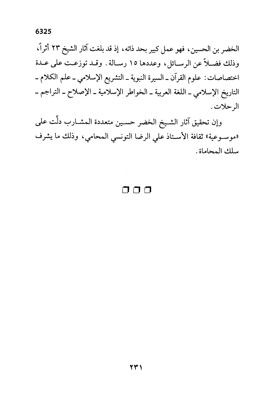 الخضر بن الحسين، فهو عمل كبير بحد ذاته، إذ قد بلغت آثار الشيخ 23 أثراً، وذلك فضلاً عن الرسائل، وعددها 15 رسالة. وقد توزعت على عدة اختصاصات: علوم القرآن - السيرة النبوية - التشريع الإسلامي - علم الكلام - التاريخ الإسلامي - اللغة العربية - الخواطر الإسلامية - الإصلاح - التراجم - الرحلات.
