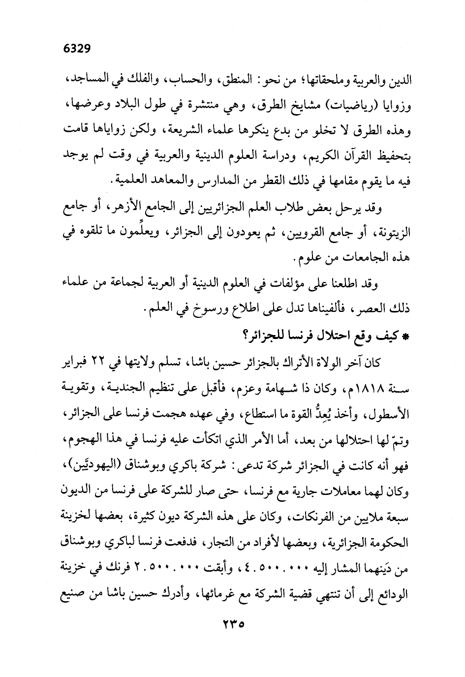 كان آخر الولاة الأتراك بالجزائر حسين باشا، تسلم ولايتها في 22 فبراير سنة 1818 م، وكان ذا شهامة وعزم، فأقبل على تنظيم الجندية، وتقوية الأسطول، وأخذ يُعِدُّ القوة ما استطاع، وفي عهده هجمت فرنسا على الجزائر، وتمّ لها احتلالها من بعد، أما الأمر الذي اتكأت عليه فرنسا في هذا الهجوم، فهو أنه كانت في الجزائر شركة تدعى: شركة باكري وبوشناق (اليهوديَّين)، وكان لهما معاملات جارية مع فرنسا، حتى صار للشركة على فرنسا من الديون سبعة ملايين من الفرنكات، وكان على هذه الشركة ديون كثيرة، بعضها لخزينة الحكومة الجزائرية، وبعضها لأفراد من التجار، فدفعت فرنسا لباكري وبوشناق من دَينهما المشار إليه 4.500.000، وأبقت 2.500.000 فرنك في خزينة الودائع إلى أن تنتهي قضية الشركة مع غرمائها، وأدرك حسين باشا من صنيع