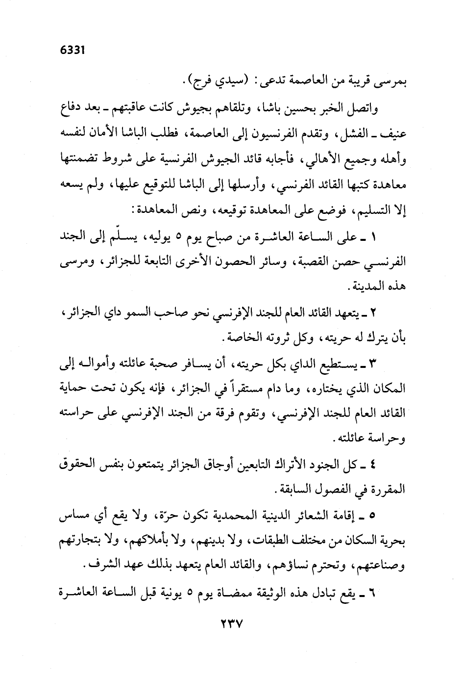 1 - على الساعة العاشرة من صباح يوم 5 يوليه، يسلّم إلى الجند الفرنسي حصن القصبة، وسائر الحصون الأخرى التابعة للجزائر، ومرسى هذه المدينة.